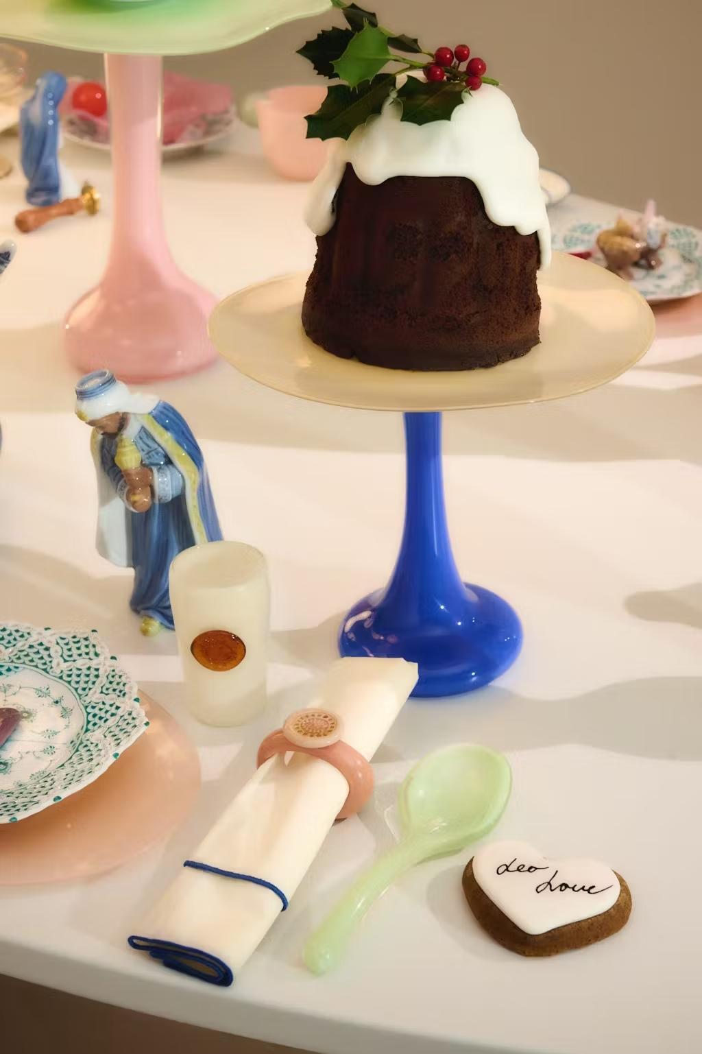 Художник по стеклу и дизайнер Хелле Мардаль известна своей красочной и игривой манерой, в которой стекло выглядит почти съедобным. То же самое можно сказать и о ее варианте новогоднего стола, где традиционная посуда с синим декором дополнена бокалами из ее красочной вселенной.