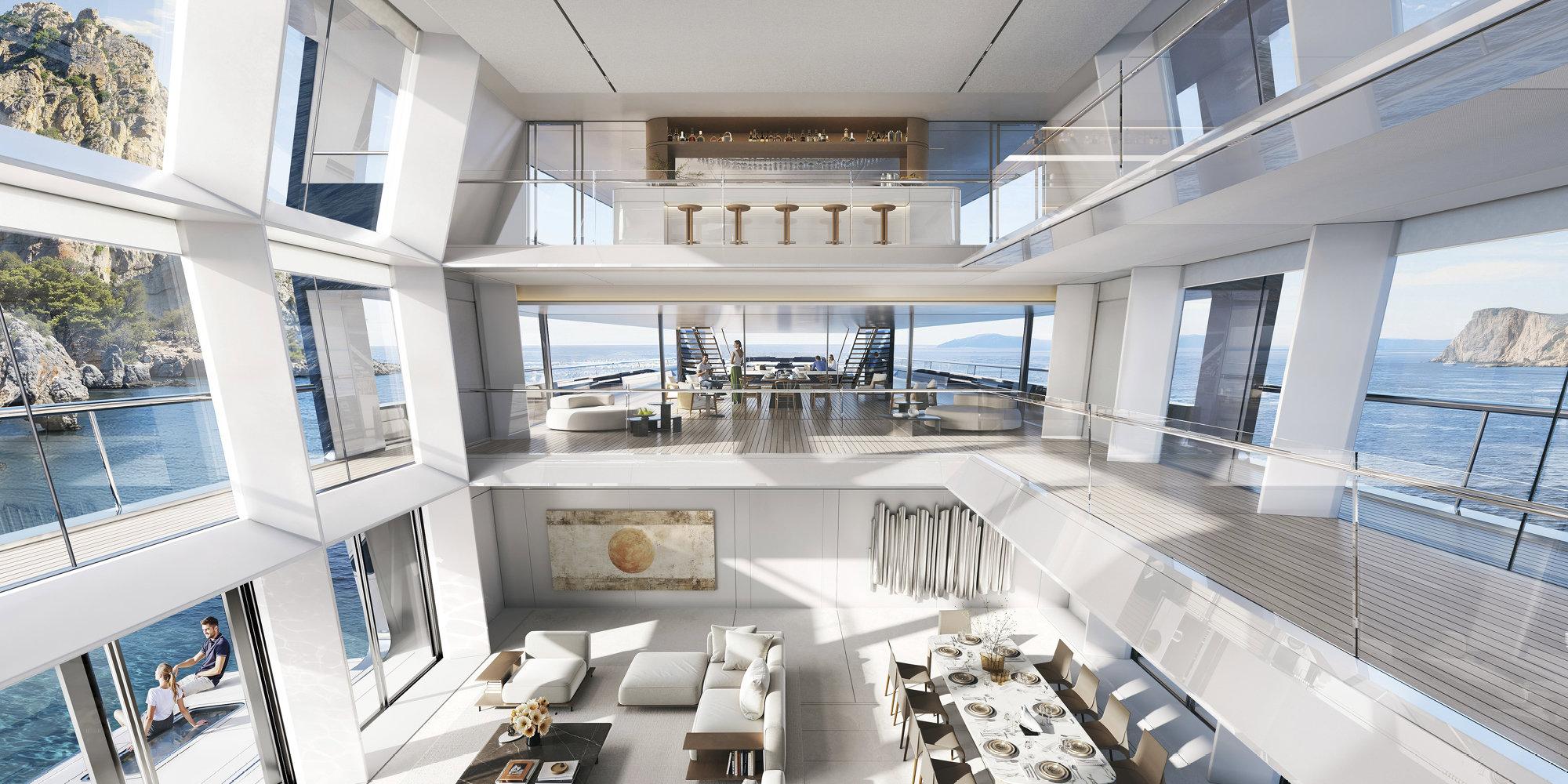 Техническая особенность яхты — машинное отделение расположено не на корме, а перенесено на нос. Это значительно (на 40%) увеличивает пространство: позволяет создать просторный внутренний атриум, беспрерывный ряд кают, а также разместить на корме бассейн и вертолетную площадку.