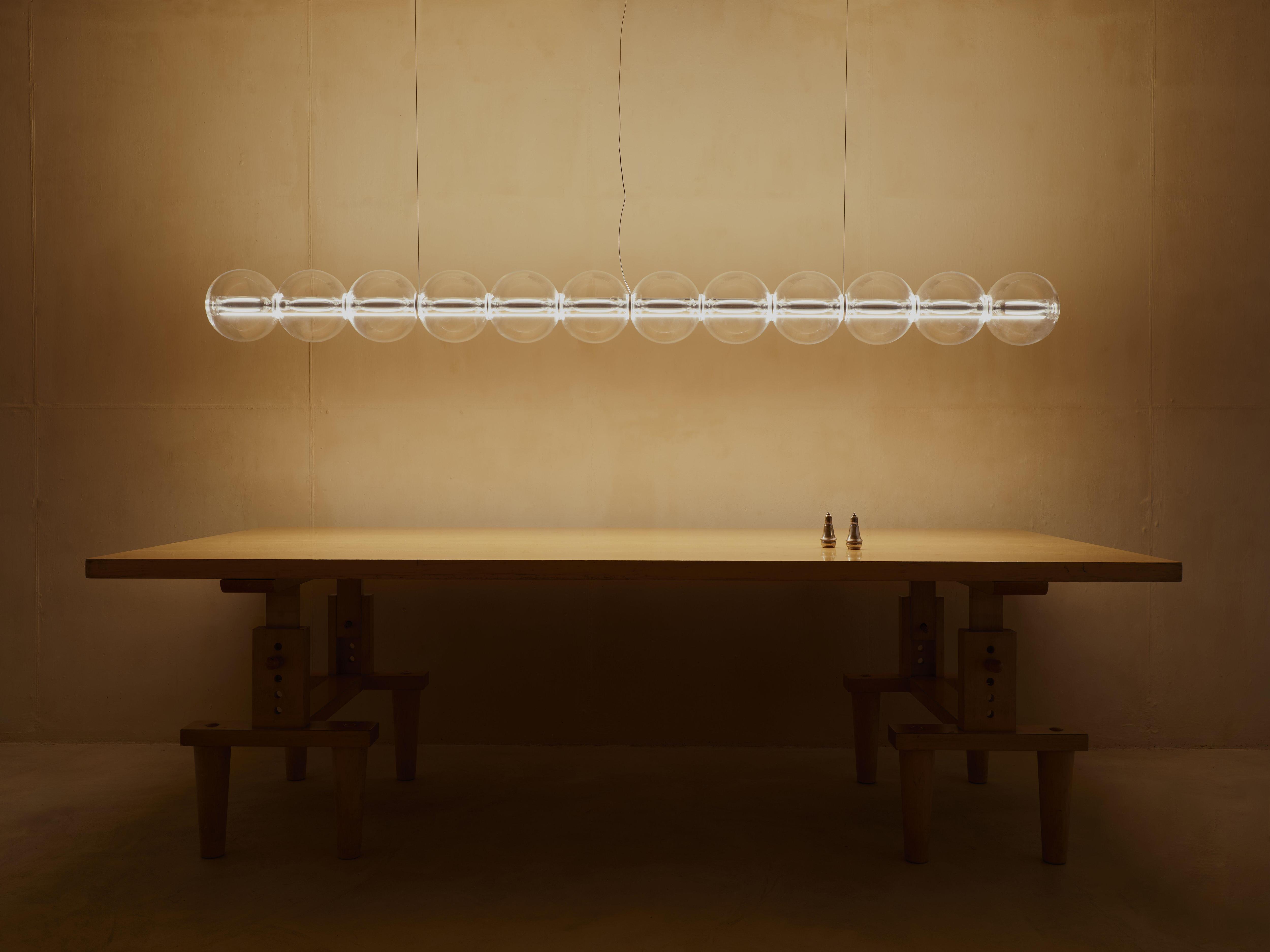 В Luce Cilindrica, в отличие от Luce Sferica, цилиндрические модули, но сама технология та же. Этот светильни Буруллек создавал для входа в музей коллекции Пино, который отреставрировал притцкеровский лауреат Тадао Андо. Версия этого года отличается тем, что дизайнер решил поменять цельнолитое стекло на боросиликатное — оно гораздо легче и помогает лучше выразить чувство легкости и невесомости, к которому стремится Буруллек. «Это что-то магическое, что вот-вот исчезнет», — говорит он.