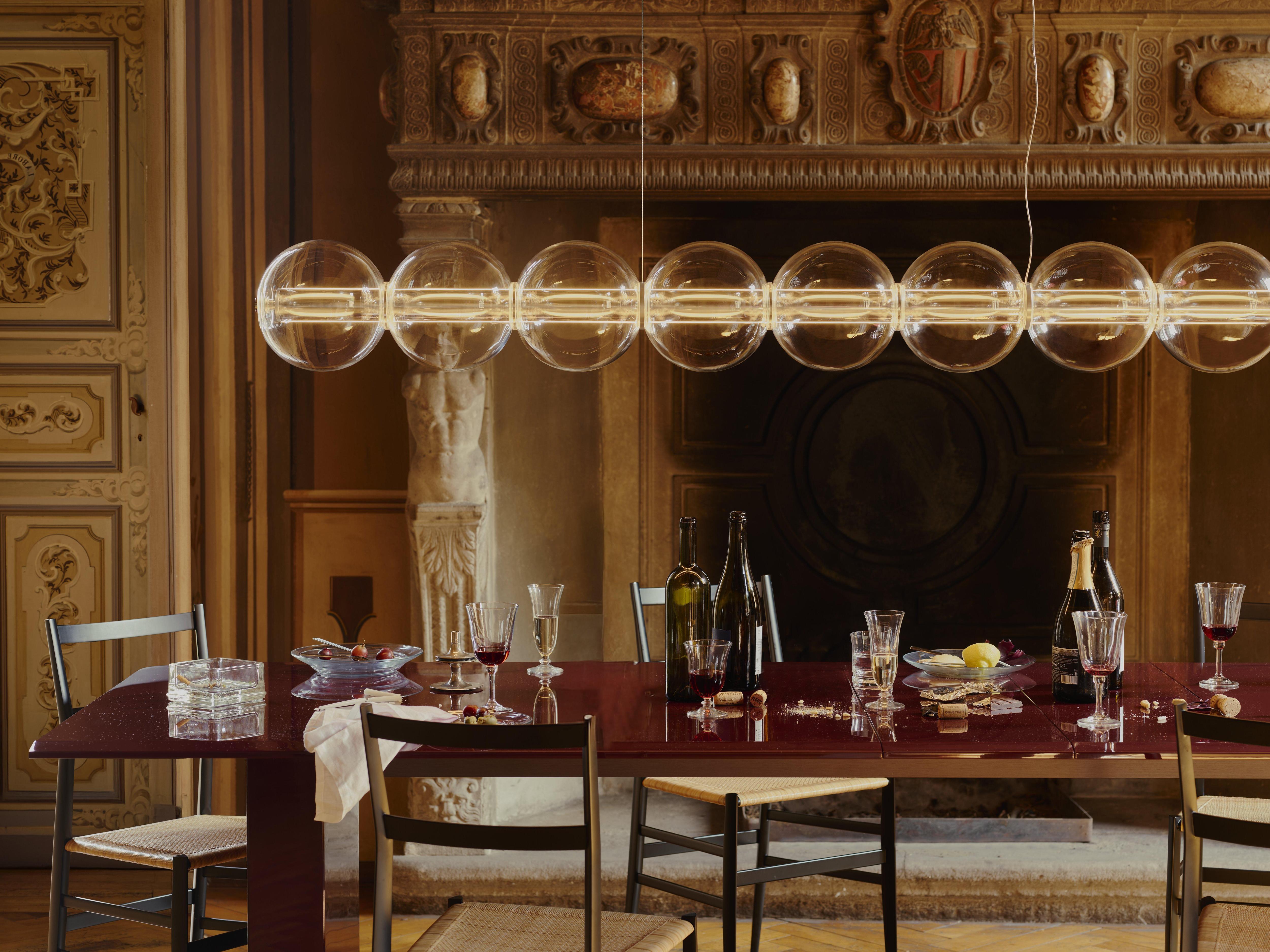 «Luce Sferica — это светильник, который стремится к изысканности и простой красоте: его форма напоминает капли дождя, цепляющиеся за провода, или мыльные пузыри, которые надувают дети», — говорит дизайнер Ронан Буруллек (Ronan Bouroullec).