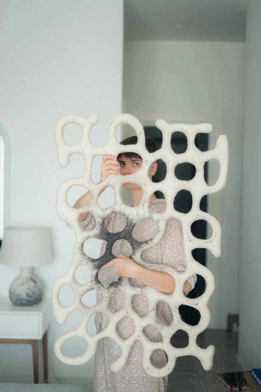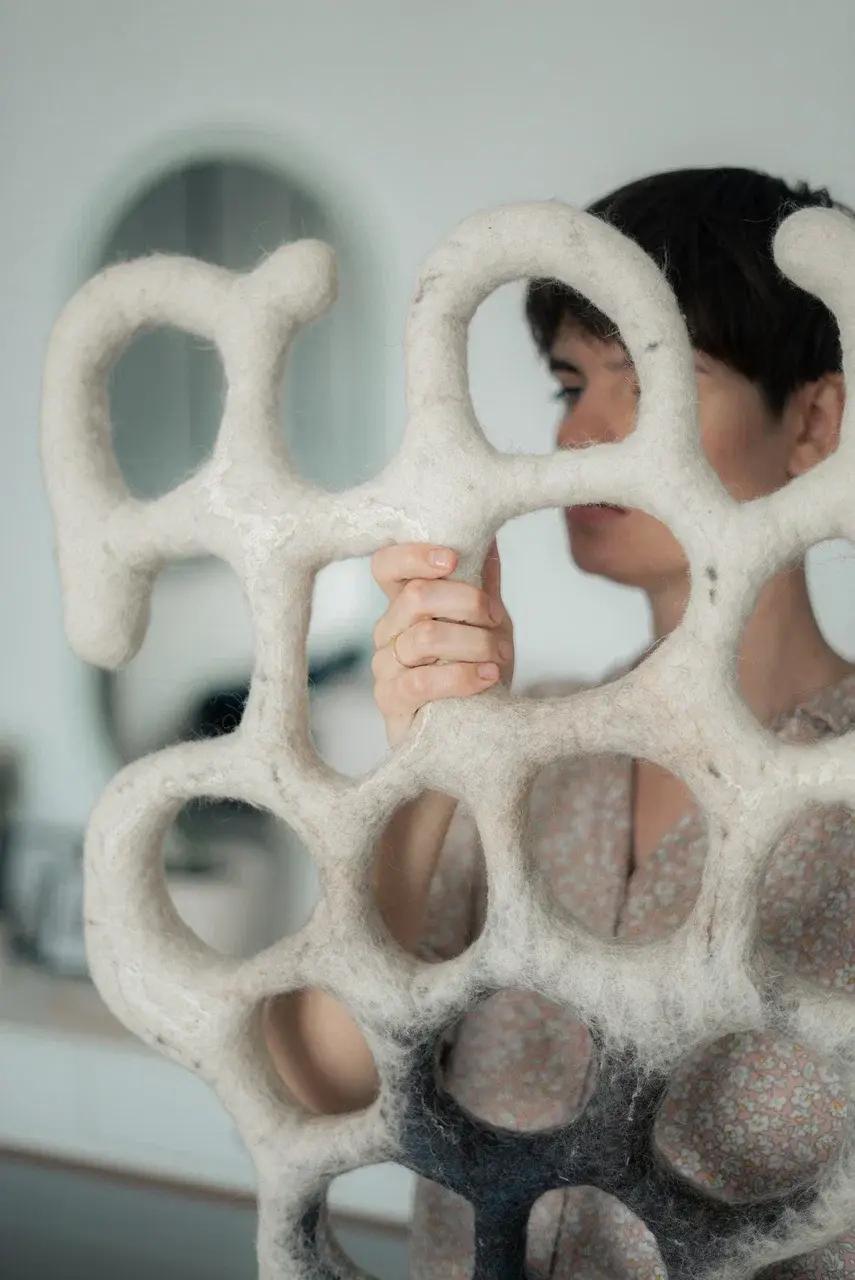 От создания концептуальной одежды она перешла к интерьерным объектам — панно, коврам, предметам декора и света. В своих работах она использует исключительно натуральные материалы — ткань, шерсть, бумагу, — комбинируя различные техники.