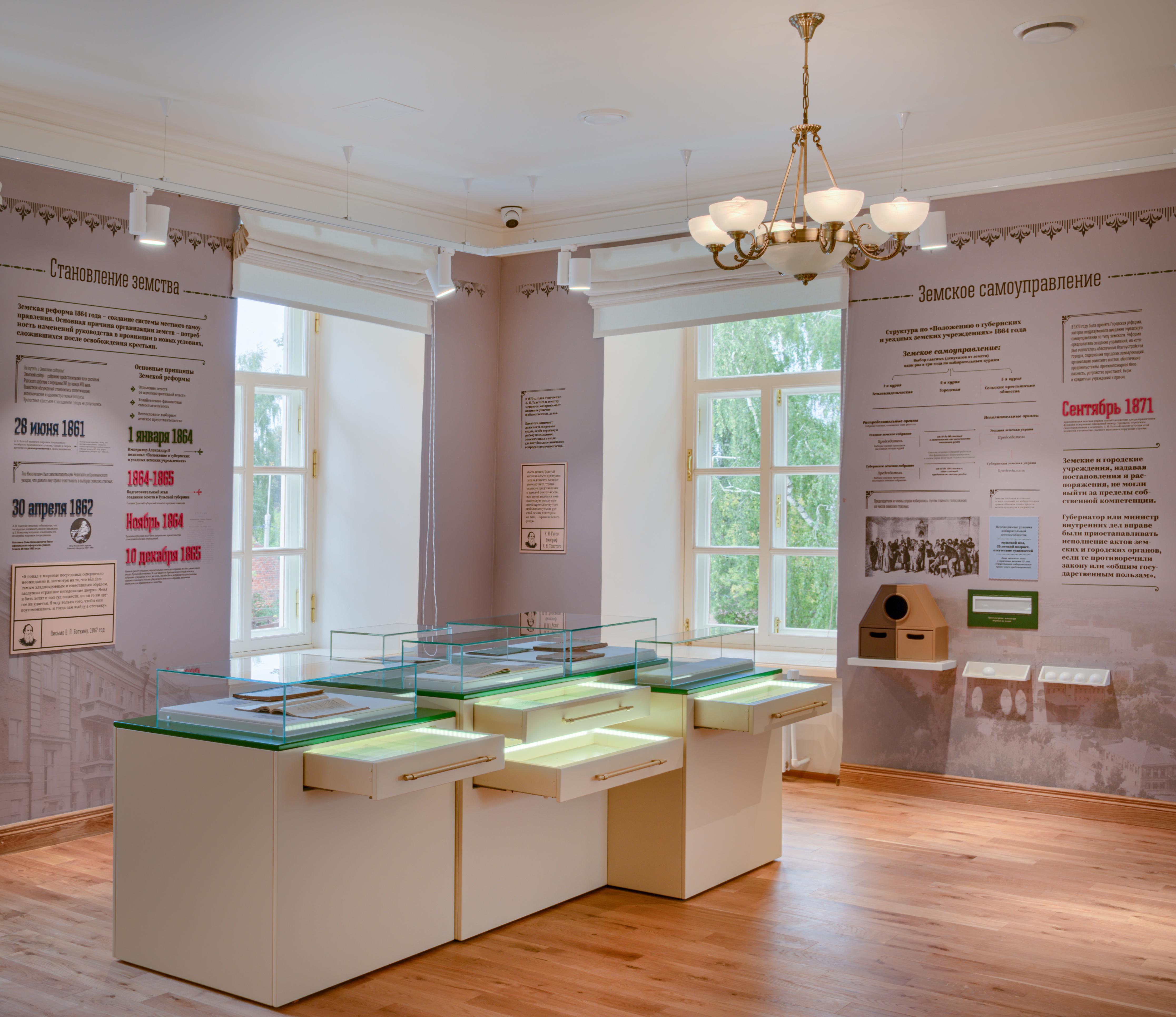 Роль Льва Николаевича Толстого, земствовавшего в Крапивенском уезде и активно участвовавшего в работе органов земского самоуправления и мировых судов, делает погружение в экспозицию совершенно особенным, так как раскрывает Толстого не только как великого писателя, но и как общественного деятеля.