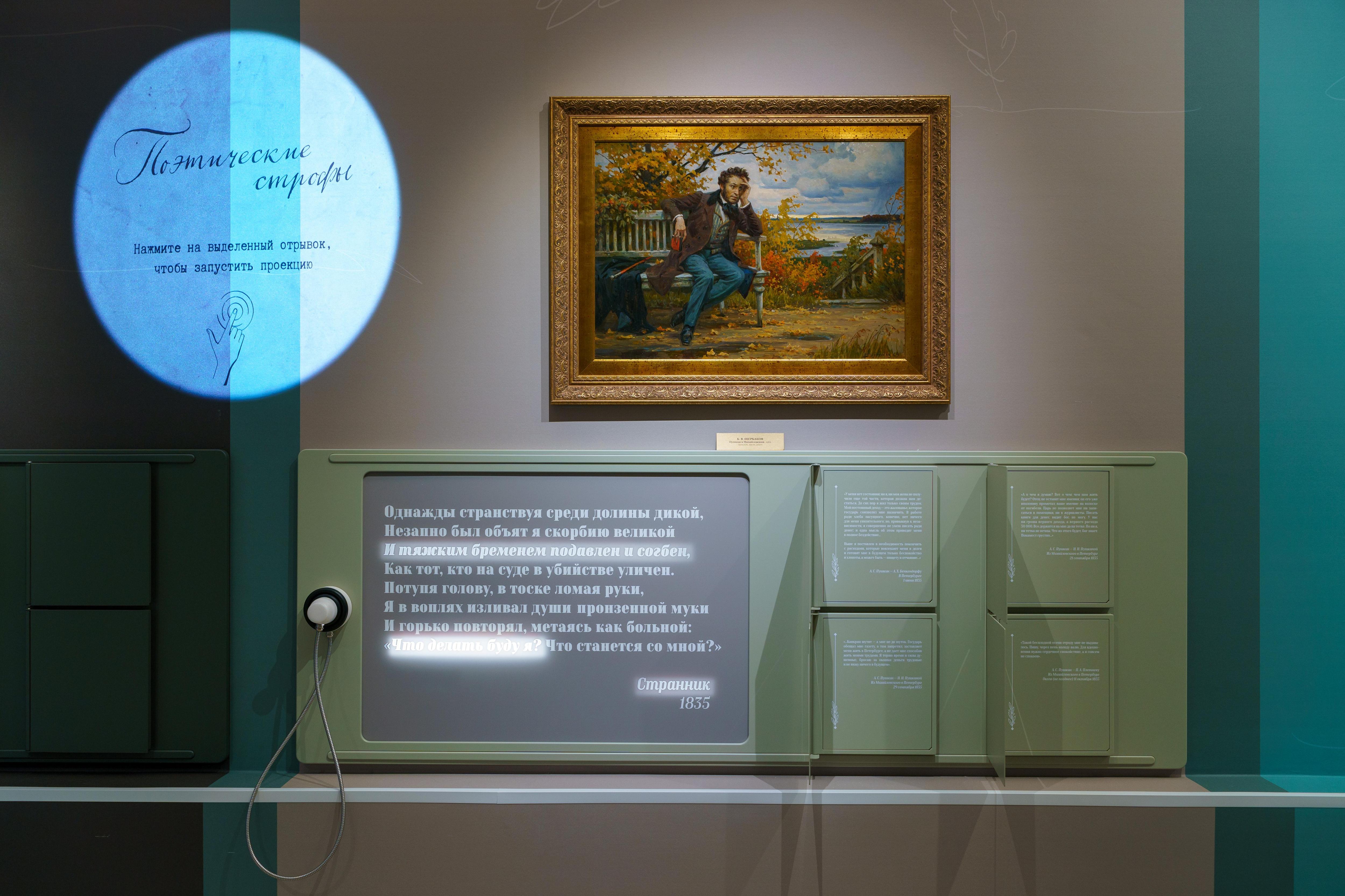 Эта экспозиция открылась в научно-культурном центре в Пушкинских Горах в 2024 году и стала самой необычной среди выставок Пушкинского заповедника. Она не стремится рассказать посетителю некую историю, а предлагает ему самому понять, как окружающая действительность вдохновляла великого поэта, вдохновиться самому и пройти опыт творческого самовыражения, обращаясь ко всем его органам чувств и ставя во главу угла эмоциональный ракурс восприятия.