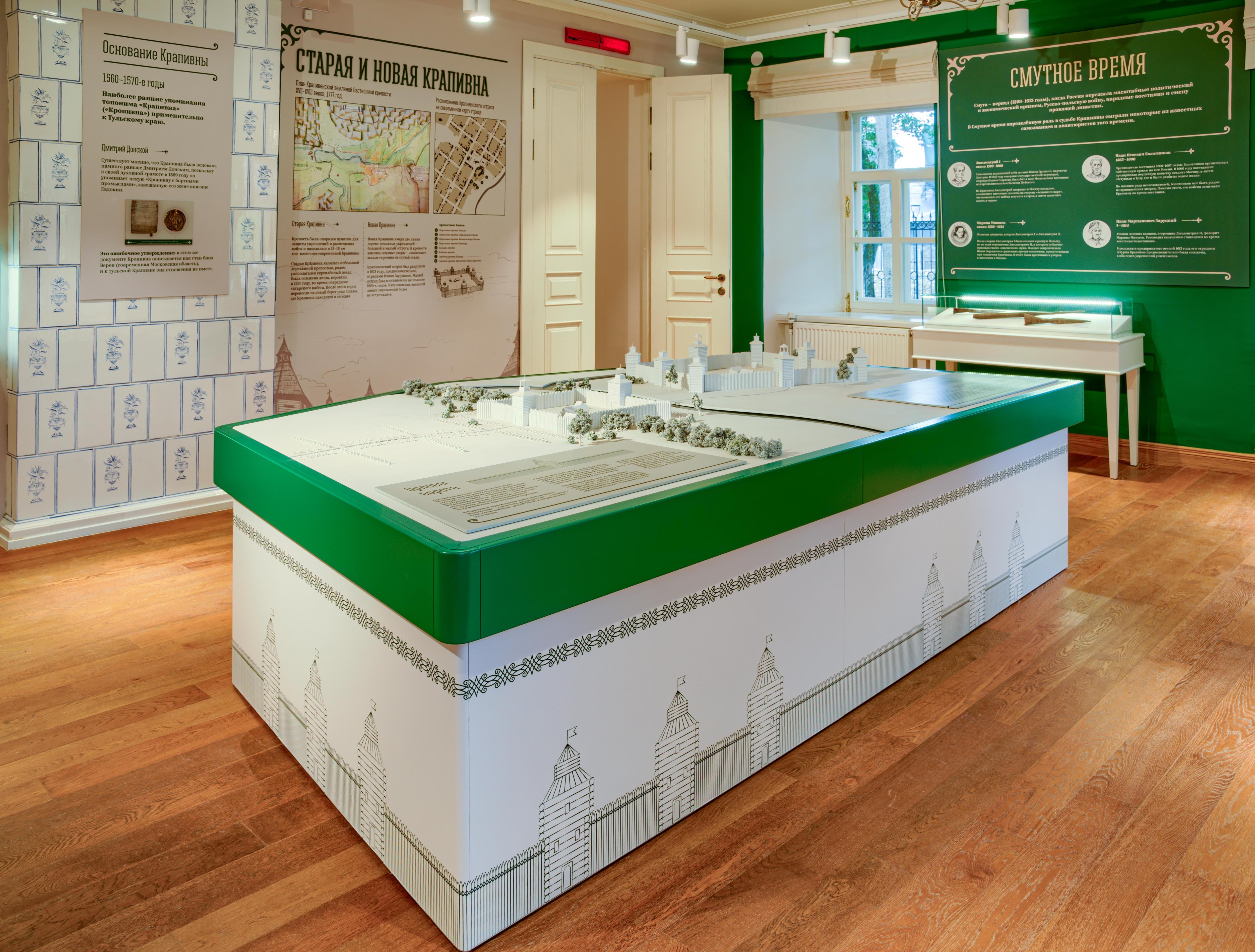 Посетитель экспозиции сразу погружается в историю города и российского градостроительства во времена существования Большой засечной черты в этих местах. Далее экспозиция знакомит посетителя с эпохой реформы земского самоуправления, подробно освещая все аспекты общественной жизни страны, губернии и города. Сценография экспозиции вписывает Крапивну в общероссийскую историю и культуру, погружая посетителей в, пожалуй, самое подробное описание истории и быта земств.