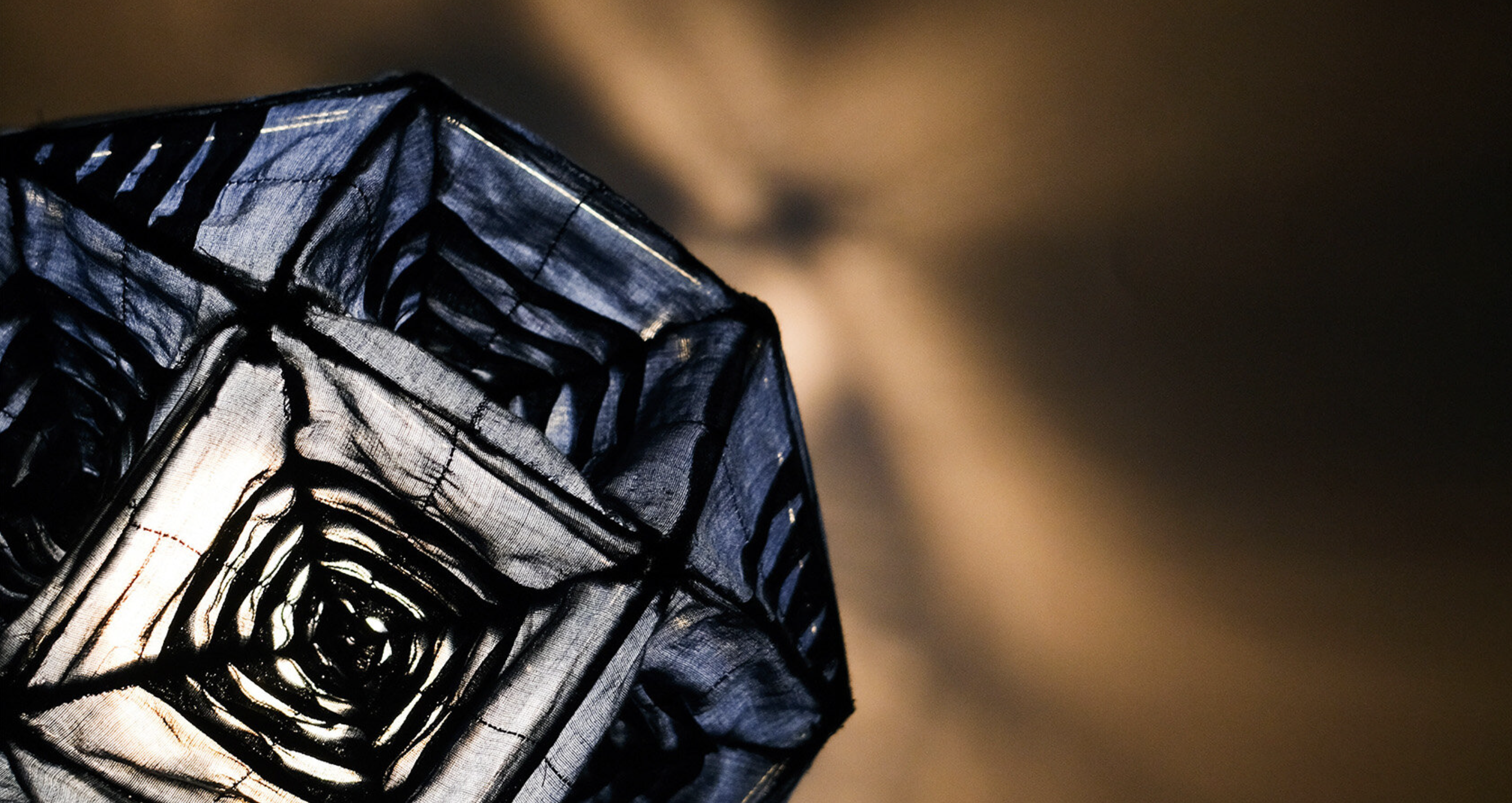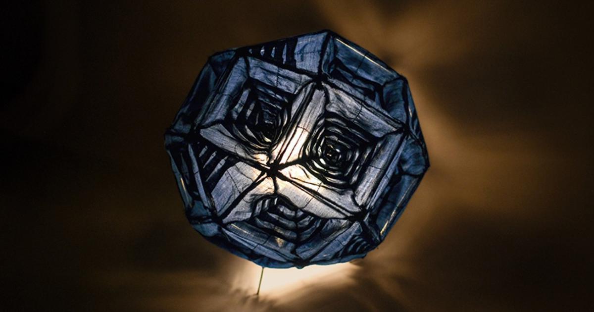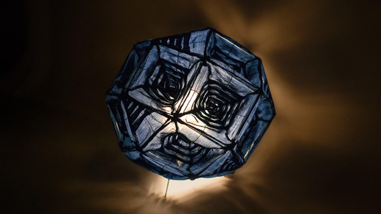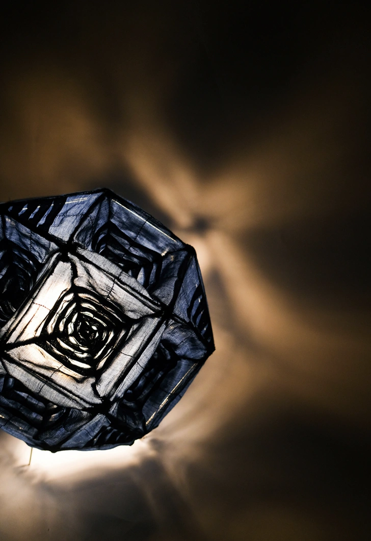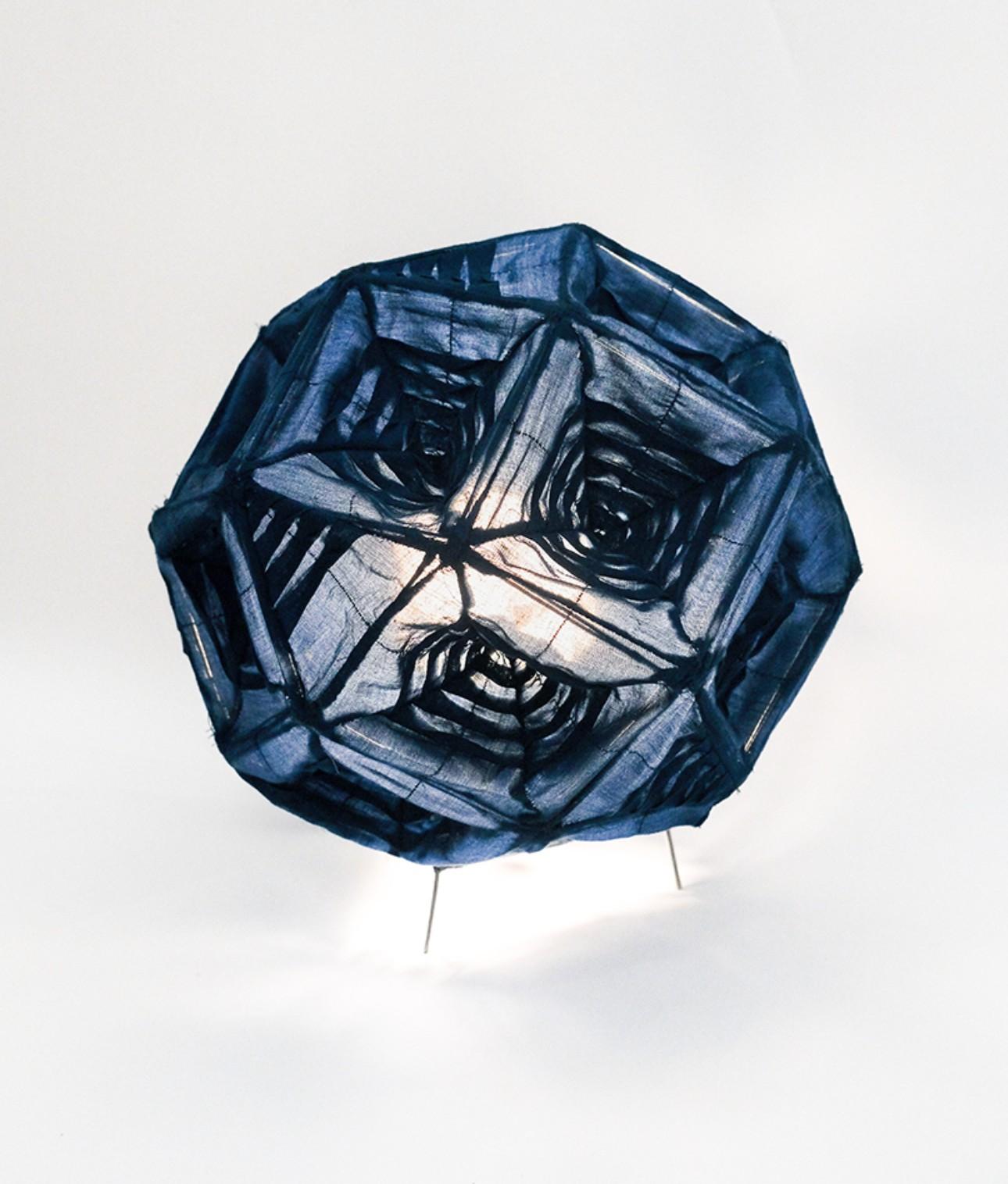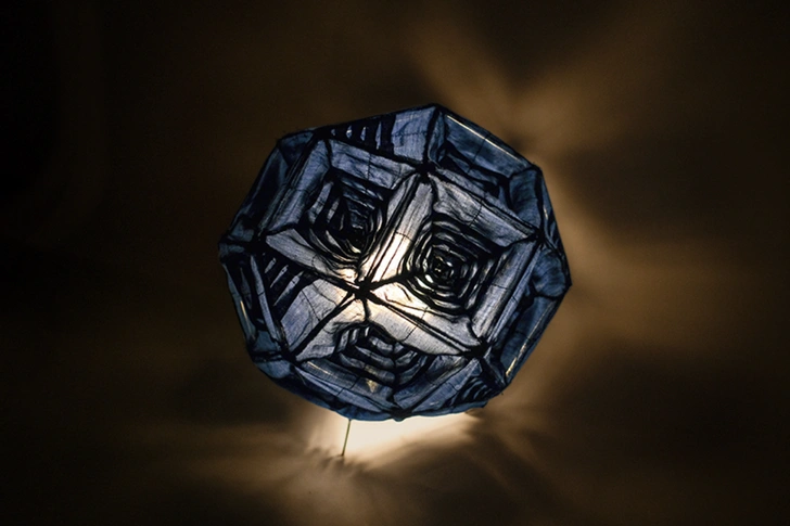 Свет раскрывает новые оттенки синей материи, напоминает летнее вечернее небо. Благодаря геометричному узору и многогранности фигуры лампа выглядит объемной. На 24 гранях ритмично чередуются узоры, плотные и более прозрачные участки, благодаря этому на стенах вырисовываются теневые калейдоскопические орнаменты.