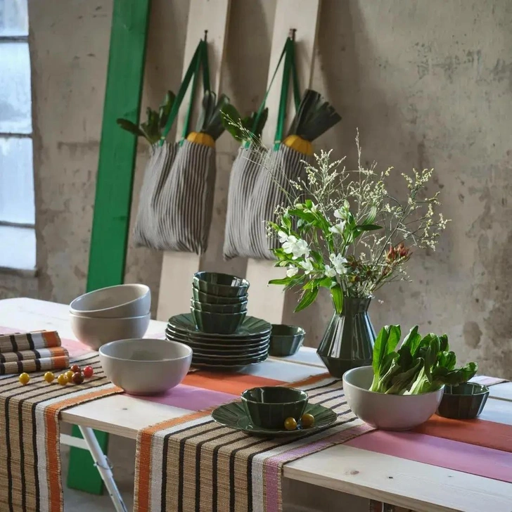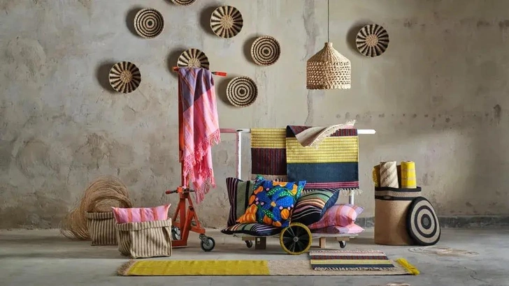 Коллекция включает текстиль для дома, аксессуары для хранения и декоративные предметы. В ассортимент вошли подушки, ковры, светильники, корзины, а также предметы для сервировки стола. В дизайне используются оттенки зеленого и желтого цветов, а также геометрические и растительные принты.