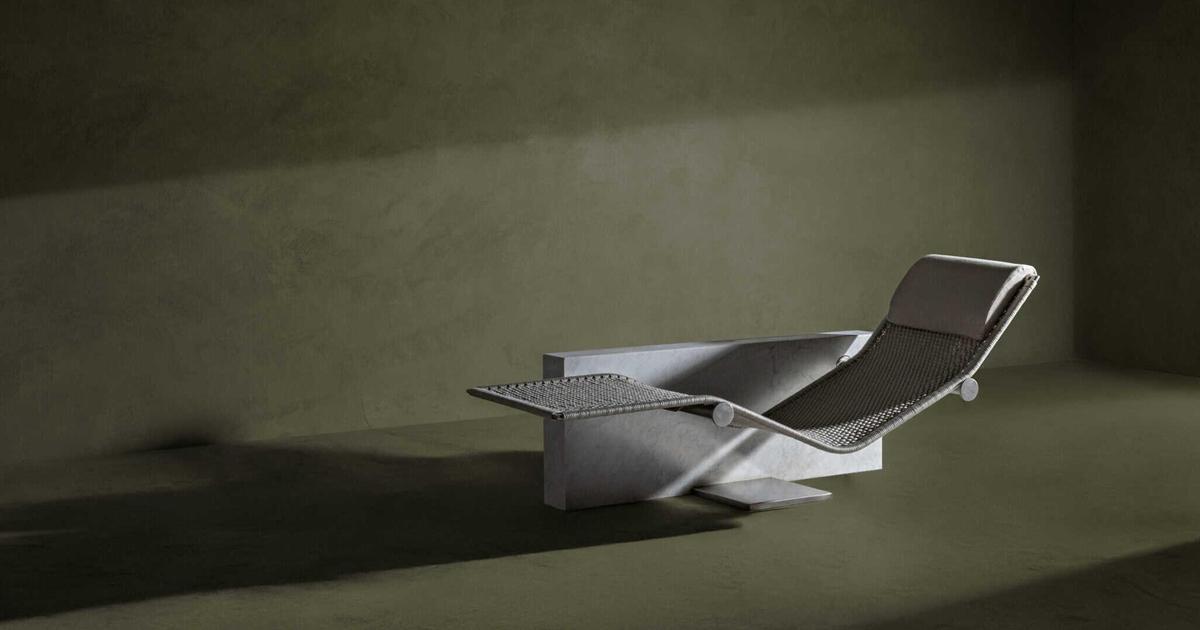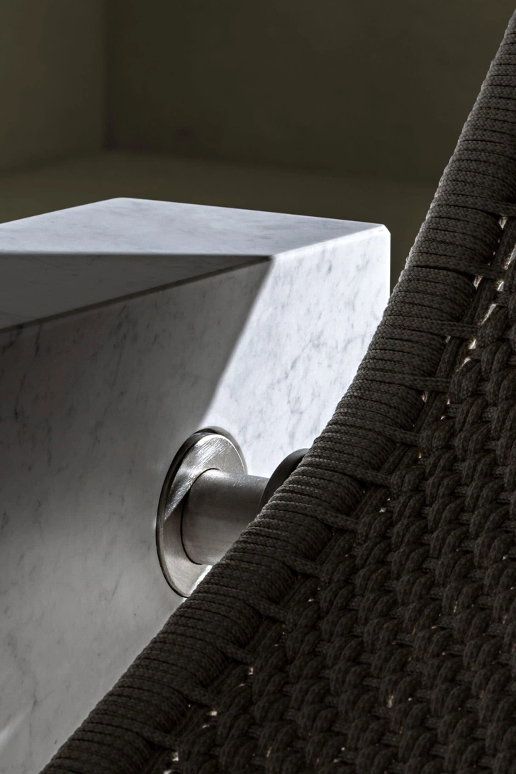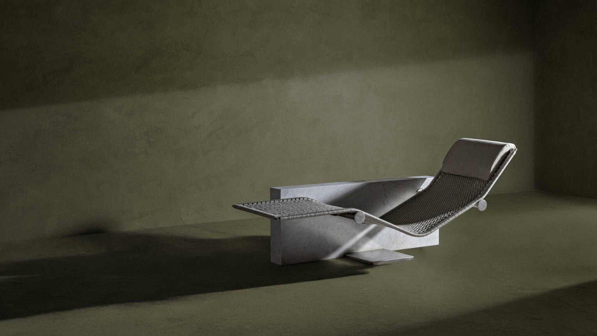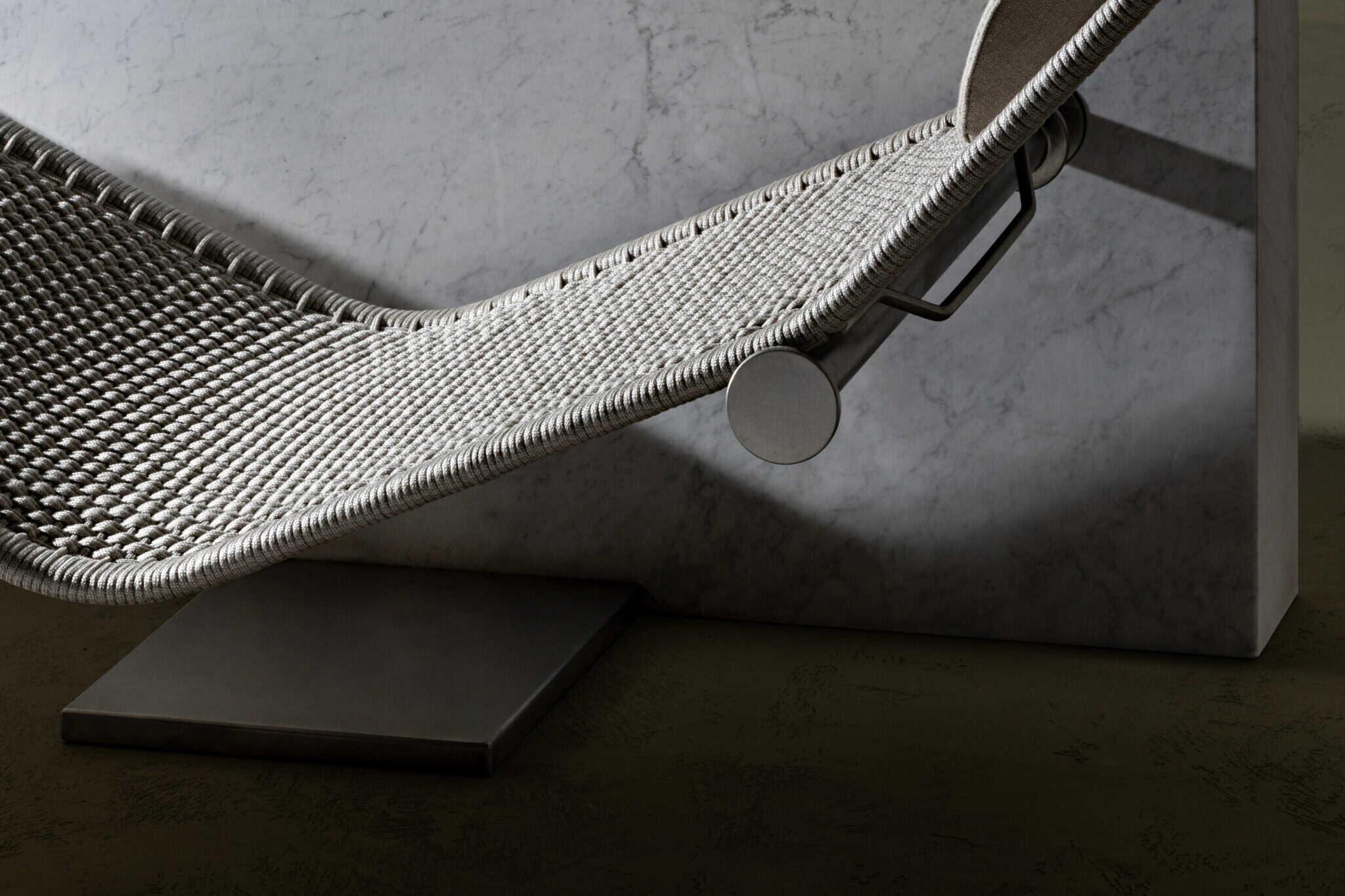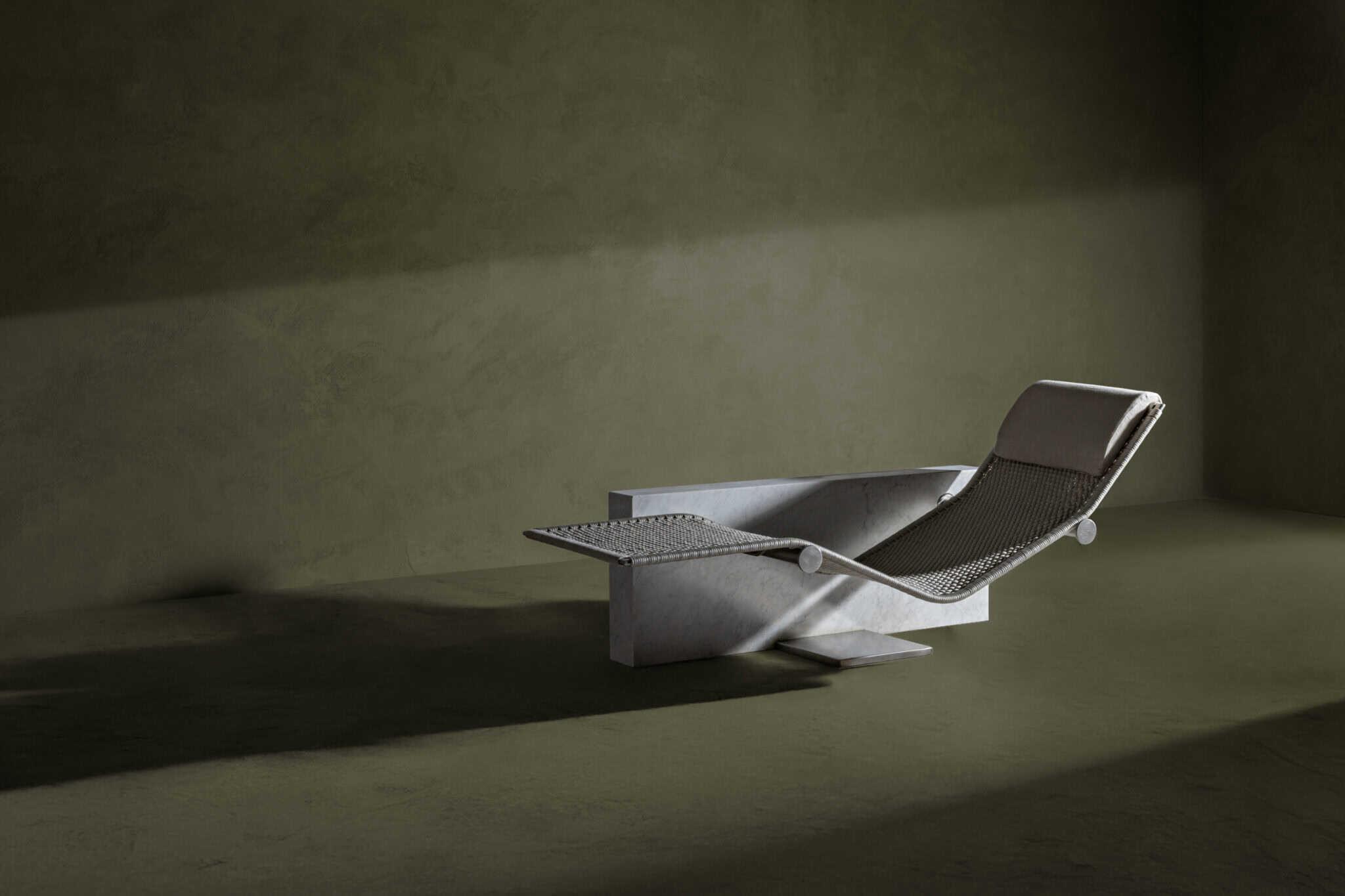 Шезлонг Vis-a-Vis от Kreo словно парит в воздухе благодаря остроумному решению дизайнера Энцо Берти. С одной стороны — подвесное сиденье из переплетенных шнуров; с другой — цельный блок мрамора. Дизайнер использовал контраст противоположностей: легкости сиденья и тяжести мраморного блока, к которому оно крепится скрытыми держателями.