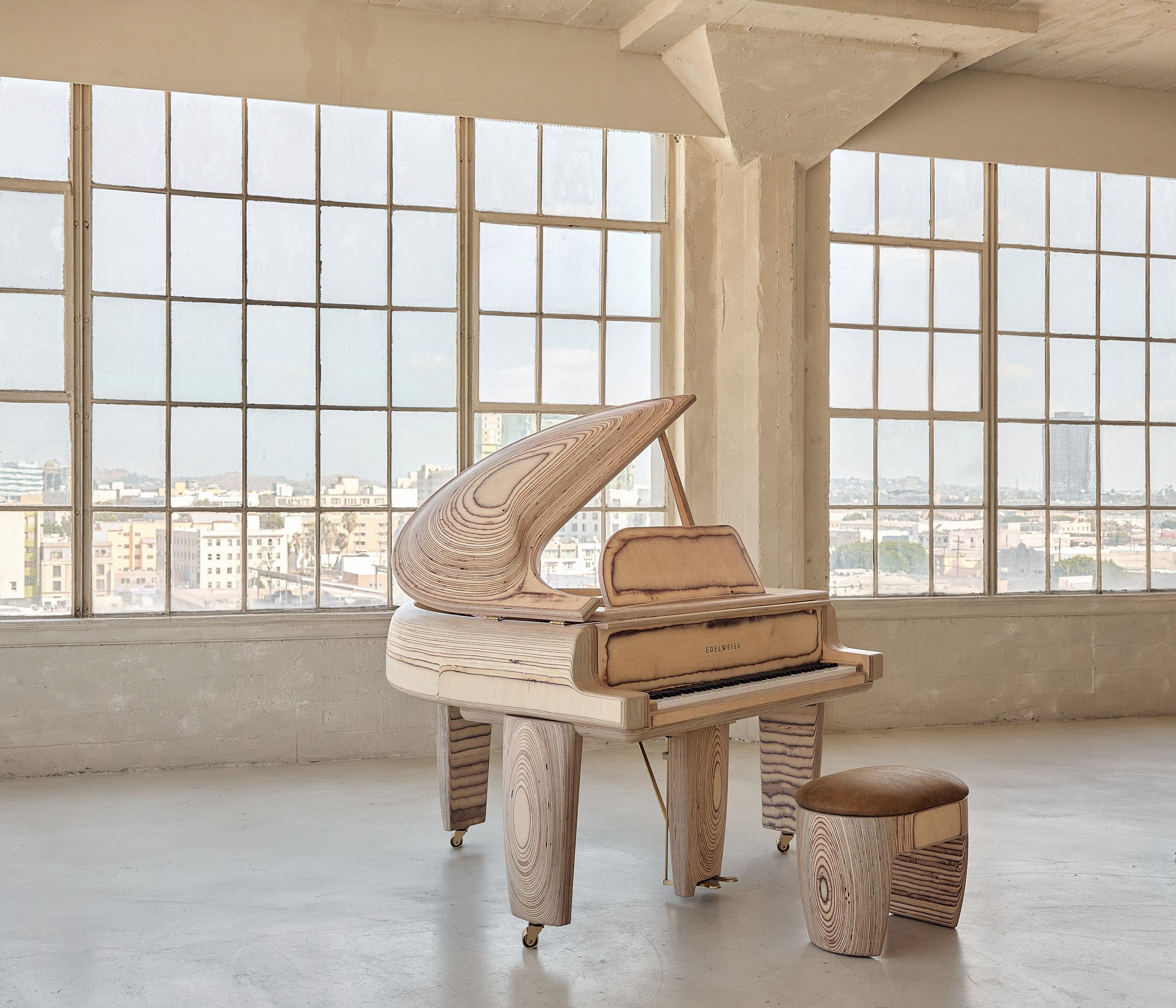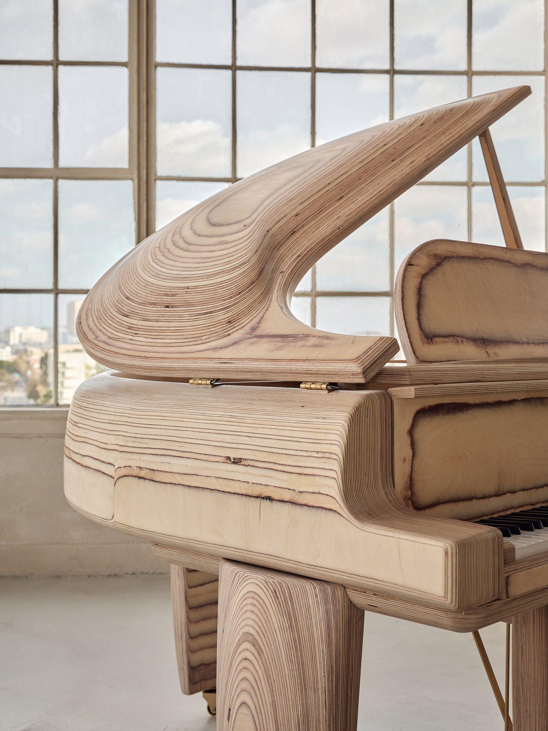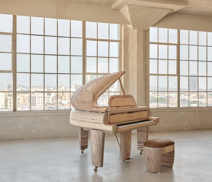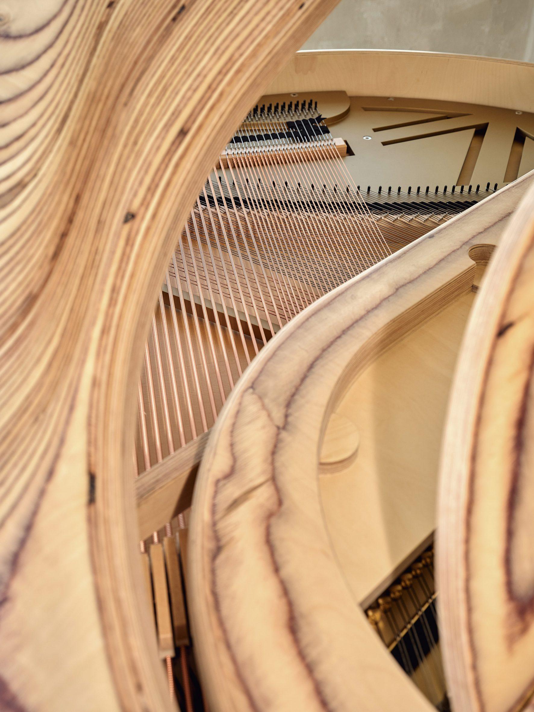 Крышка инструмента вырезана из цельного листа березового шпона и напоминает застывшую волну или песчаную дюну. Вместе с фортепиано Уэстлер спроектировала и табурет — такой же округлый, бескаркасный, из дерева.