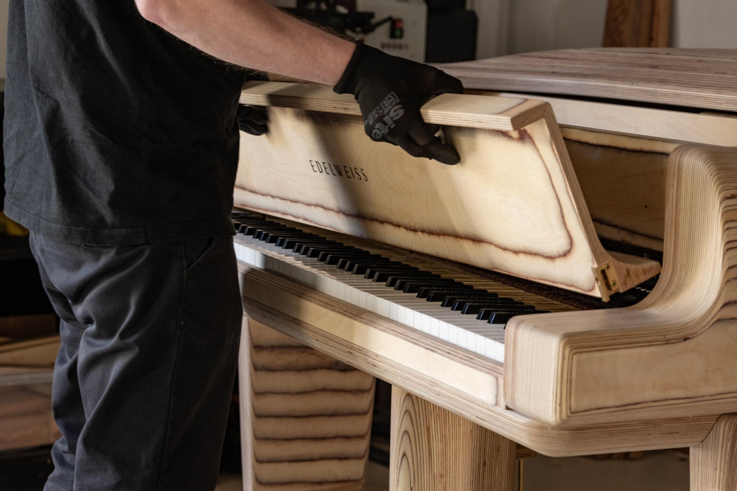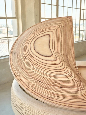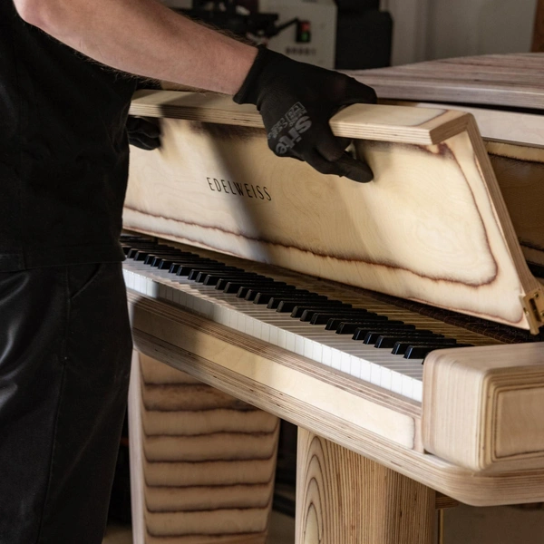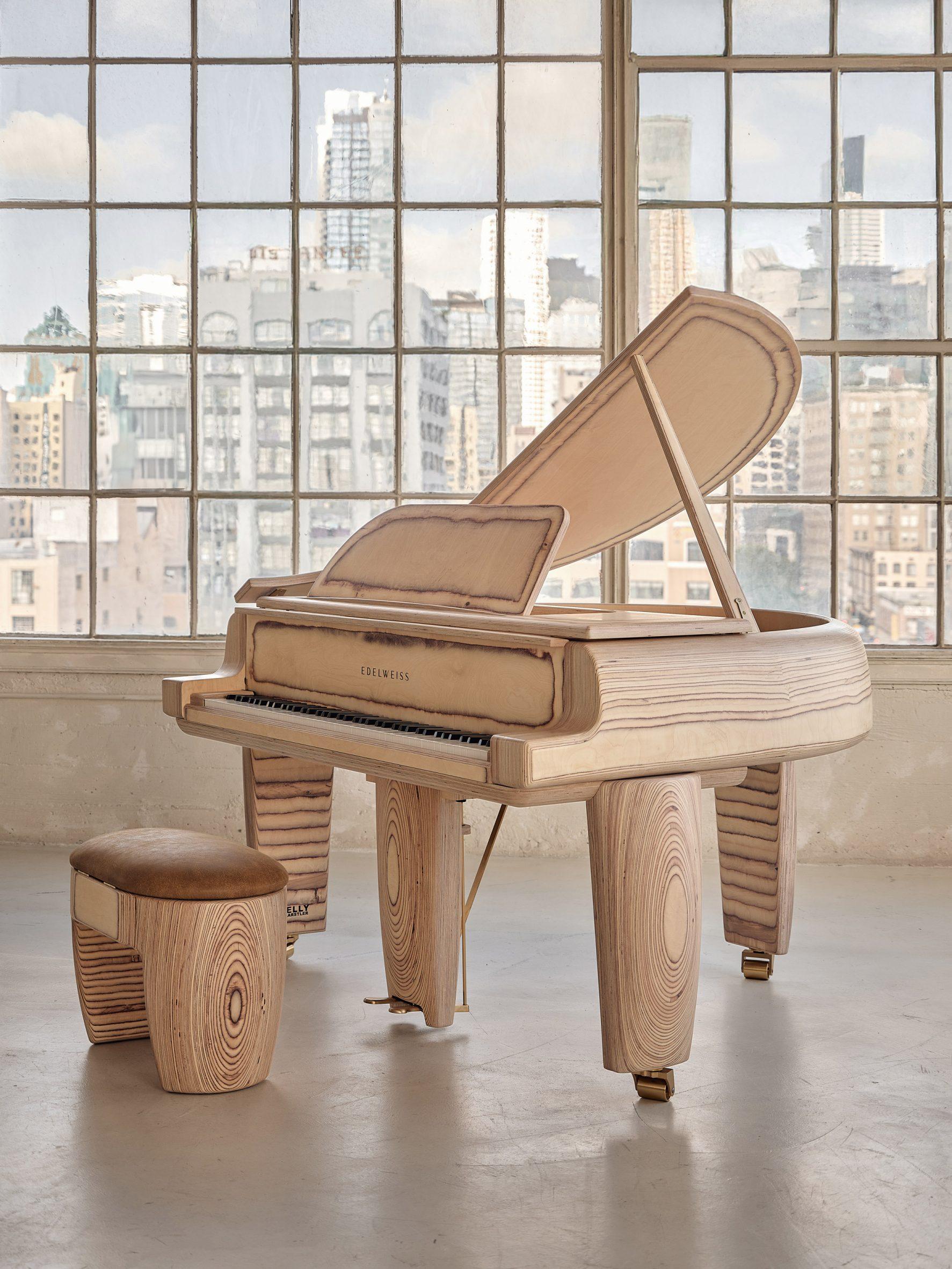 Крышка инструмента вырезана из цельного листа березового шпона и напоминает застывшую волну или песчаную дюну. Вместе с фортепиано Уэстлер спроектировала и табурет — такой же округлый, бескаркасный, из дерева.
