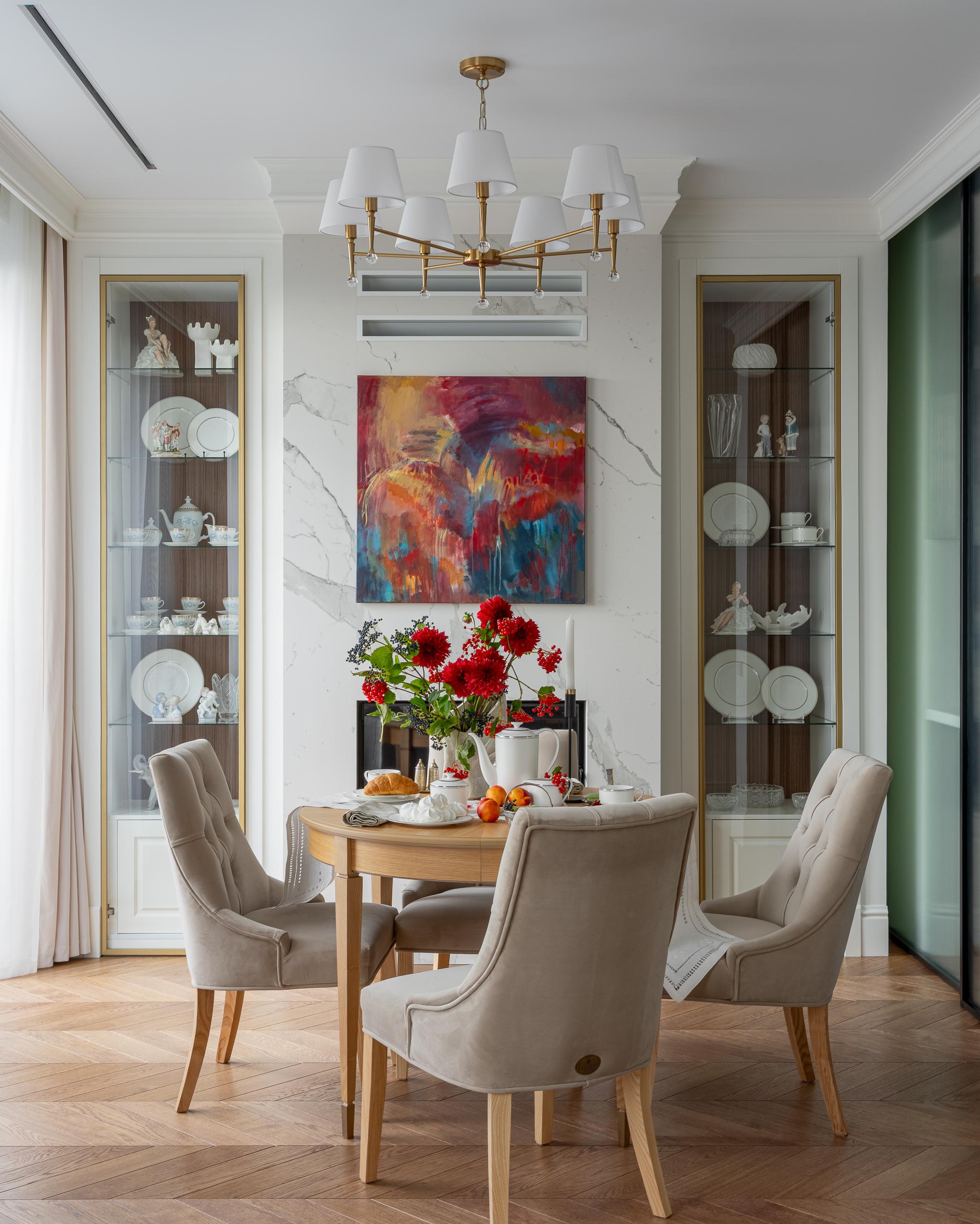 Над самим столом расположили подвесной светильник Rosemary от Freya, создающий идеальную атмосферу для долгих ужинов и бесед за кофе.
