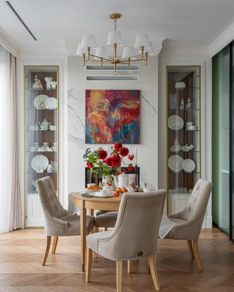 вечер — время «парадного» и уютного света. Включаются акцентные люстры, создающие чувство роскоши и праздника, и настенные бра с мягким рассеянным светом;