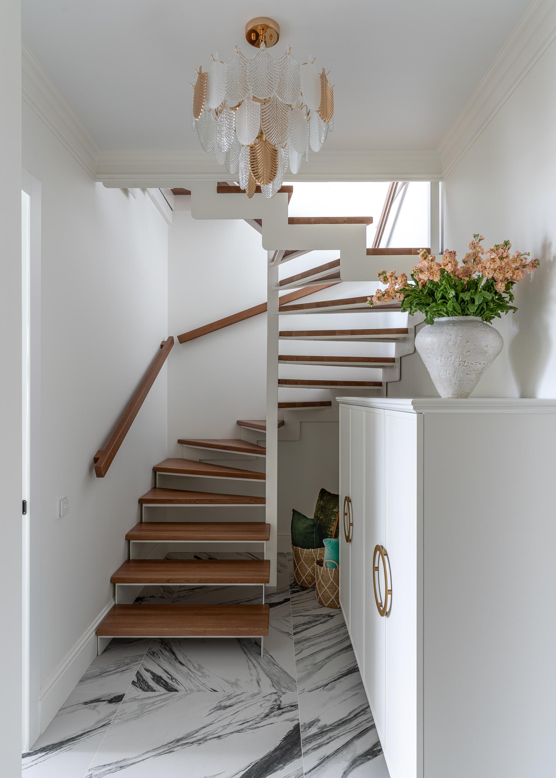 Поднимите потолки: используйте светильники, направляющие свет вверх. Отраженный от потолка свет визуально приподнимает его. Отличный пример — эффектная люстра с разноуровневыми подвесами и природным мотивом над лестницей в дизайнерском проекте двухуровневой квартиры. Она как бы приглашает заглянуть на второй уровень, создавая вертикальную динамику.