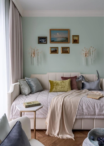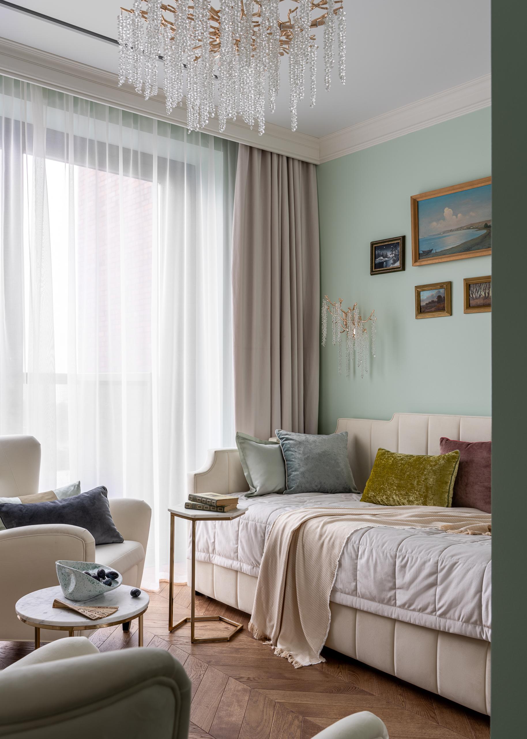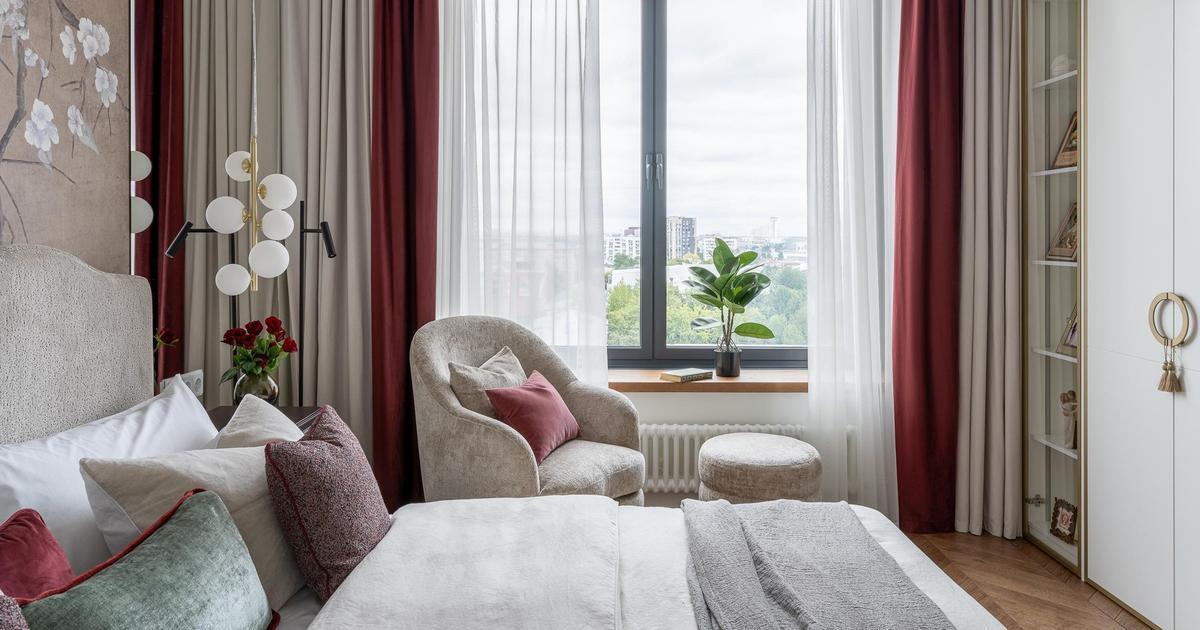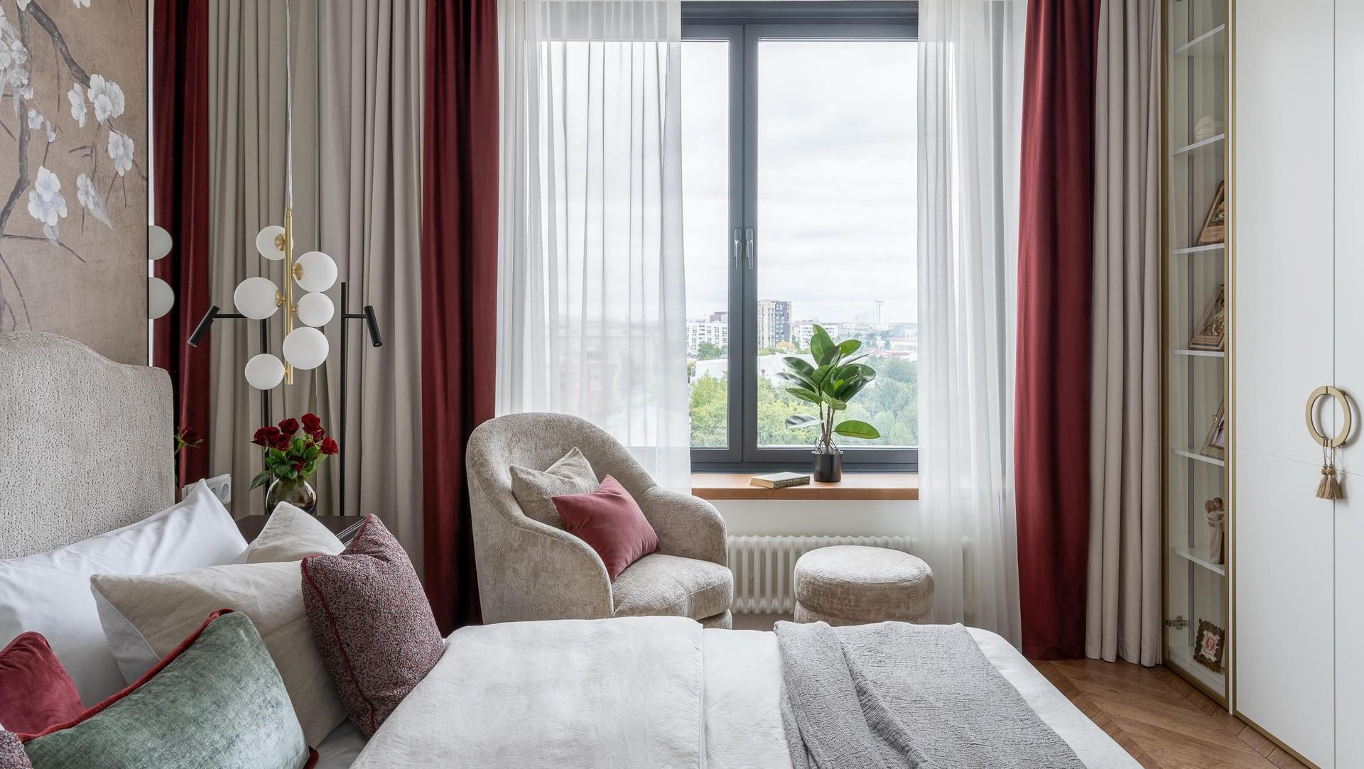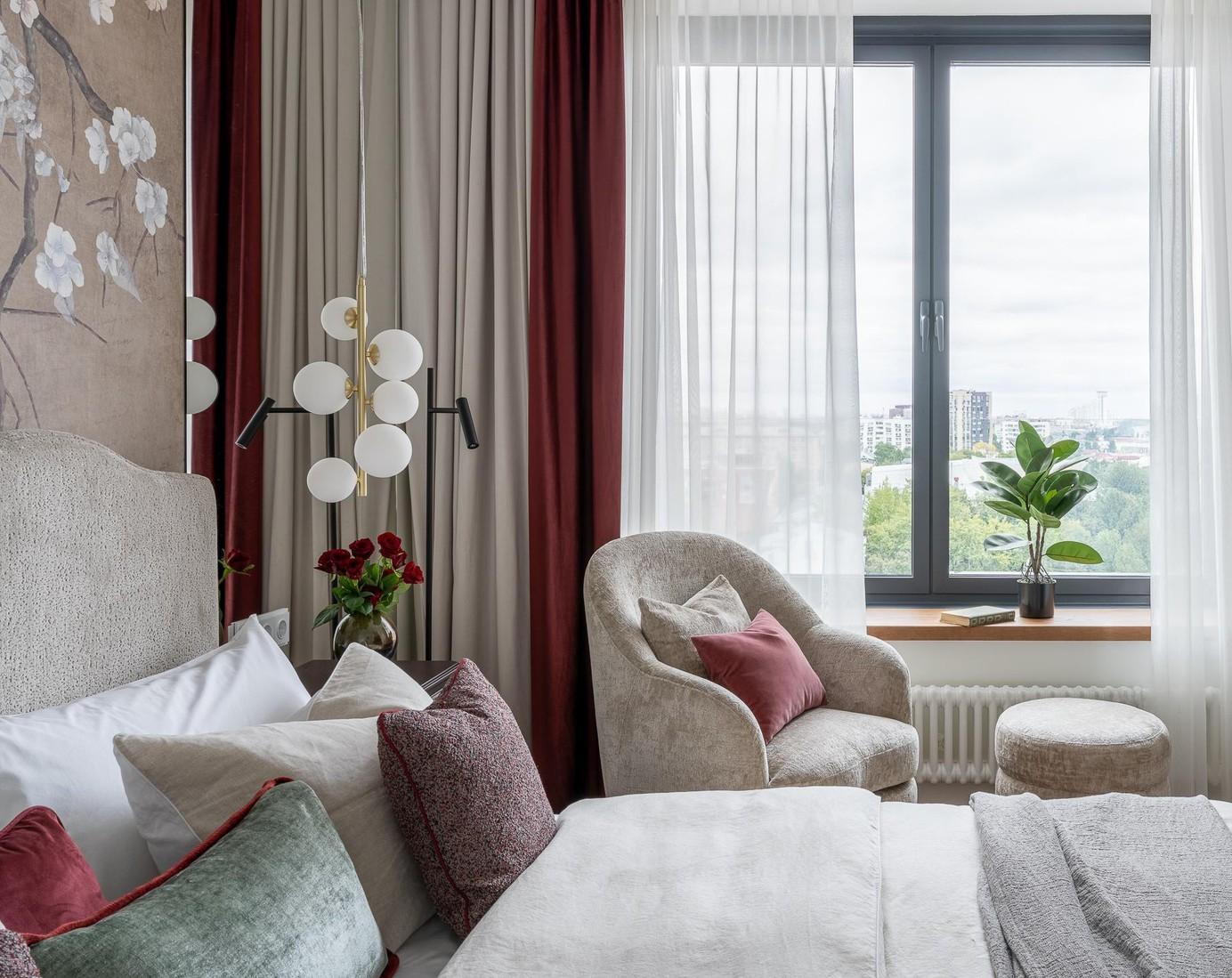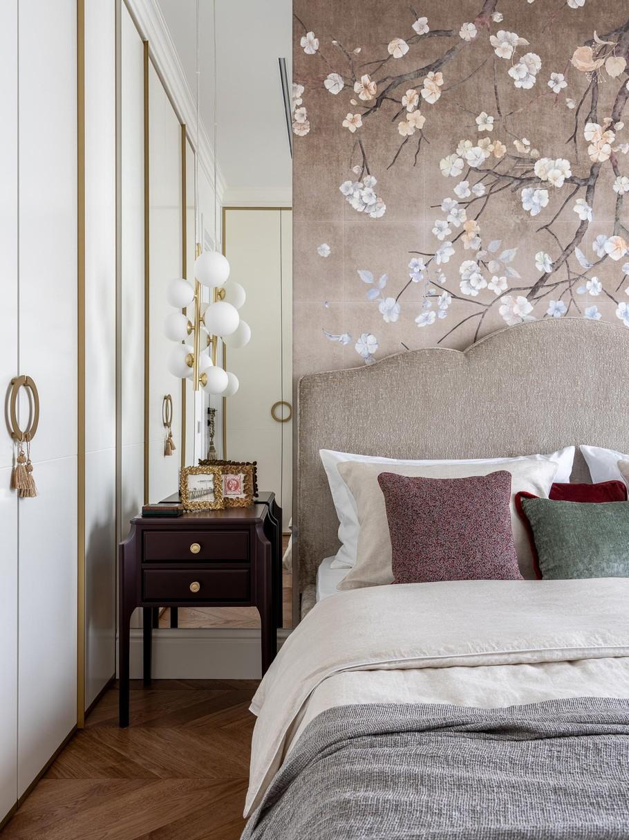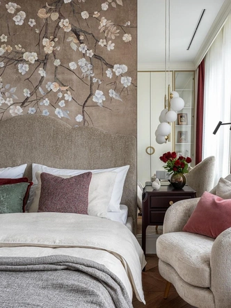 Теплый свет (2700–3000 K): идеален для спален и зон отдыха. Он имитирует закатное солнце и дает сигнал мозгу, что пора расслабиться. Главная спальня в этом проекте, напоминающая шкатулку с драгоценностями, наполнена именно таким светом. Он мягко играет на винных оттенках стен и золотых деталях декора, подчеркивая изящность интерьера.
