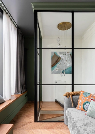 Используйте свет как арт-объект. В проекте этой двухуровневой квартиры лестница с люстрой-водопадом и фреской с туманным лесом превратилась в отдельную «тайную комнату».