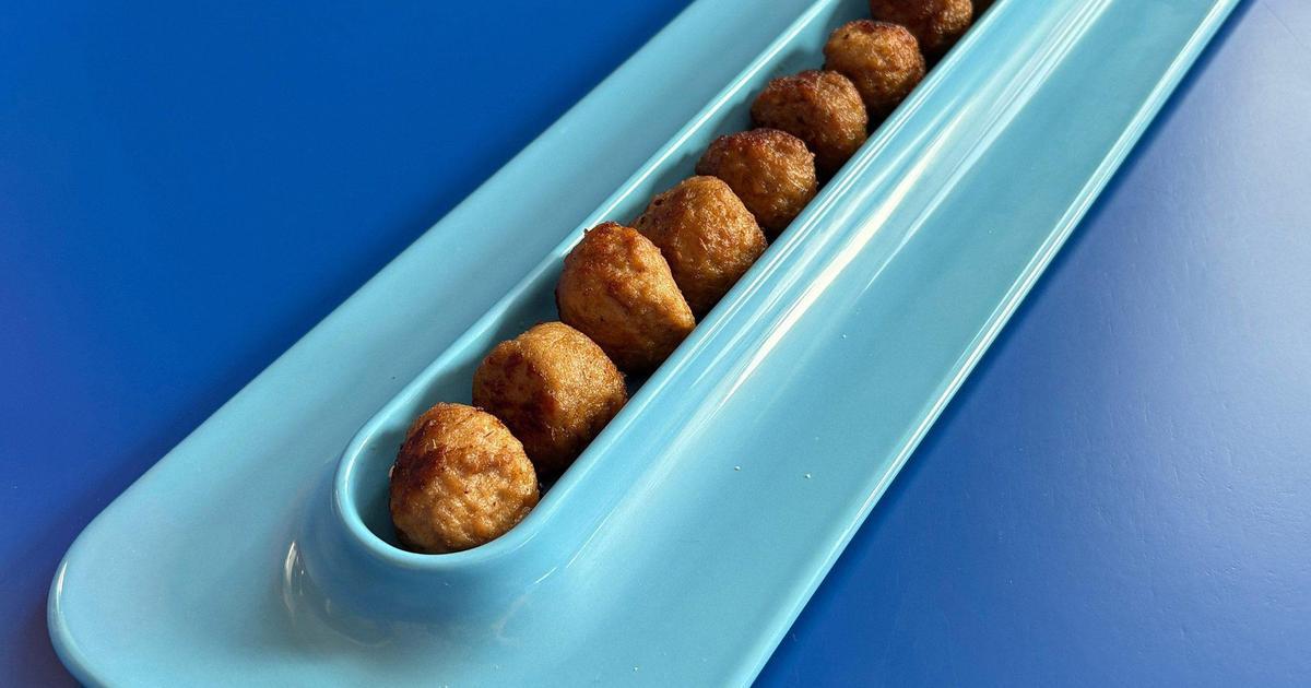 Длинное фарфоровое блюдо ярко бирюзового цвета имеет в центре специальное углубление — достаточно широкое и глубокое, чтобы вместить «фрикадельку идеального размера». «Дизайн простой: фрикадельки выстроены в ряд так, чтобы каждая была на виду, словно они сидят на маленьких тронах», — радостно комментирует дизайнер.