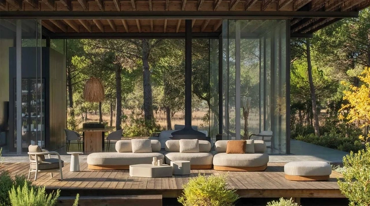 Однин из трендов этого года — диваны, столы, стулья и другая дачная мебель с тканевой обивкой и кожей. Эти покрытия адаптированы под использование на улице и защищены от влаги