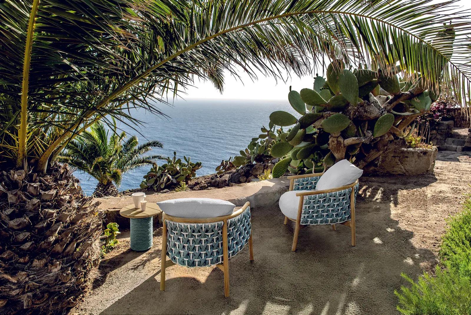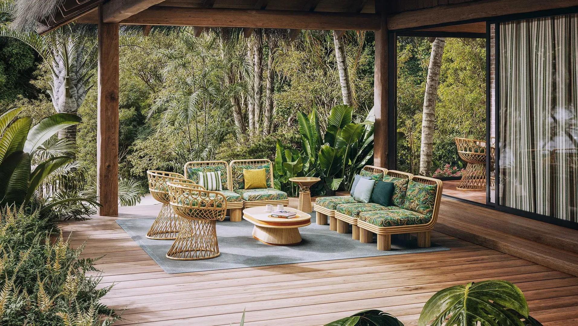 Здесь заметнее влияние общего тренда 2026 года на отсылки к винтажу в интерьере, о котором мы уже писали. В садовом интерьере рекомендуется использовать плетеную мебель из ротанга, а также декорировать пространство веревками и канатами. Последнее особенно актуально, если вы живете у моря или хотите отразить морскую стилистику.