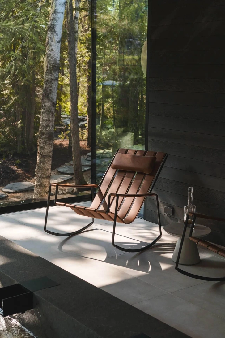 Кресло-качалка Strappy, Royal Botania. Каркас из нержавеющей стали покрыт ремнями из искусственной кожи. Все элементы съемные, что облегчает уход.
