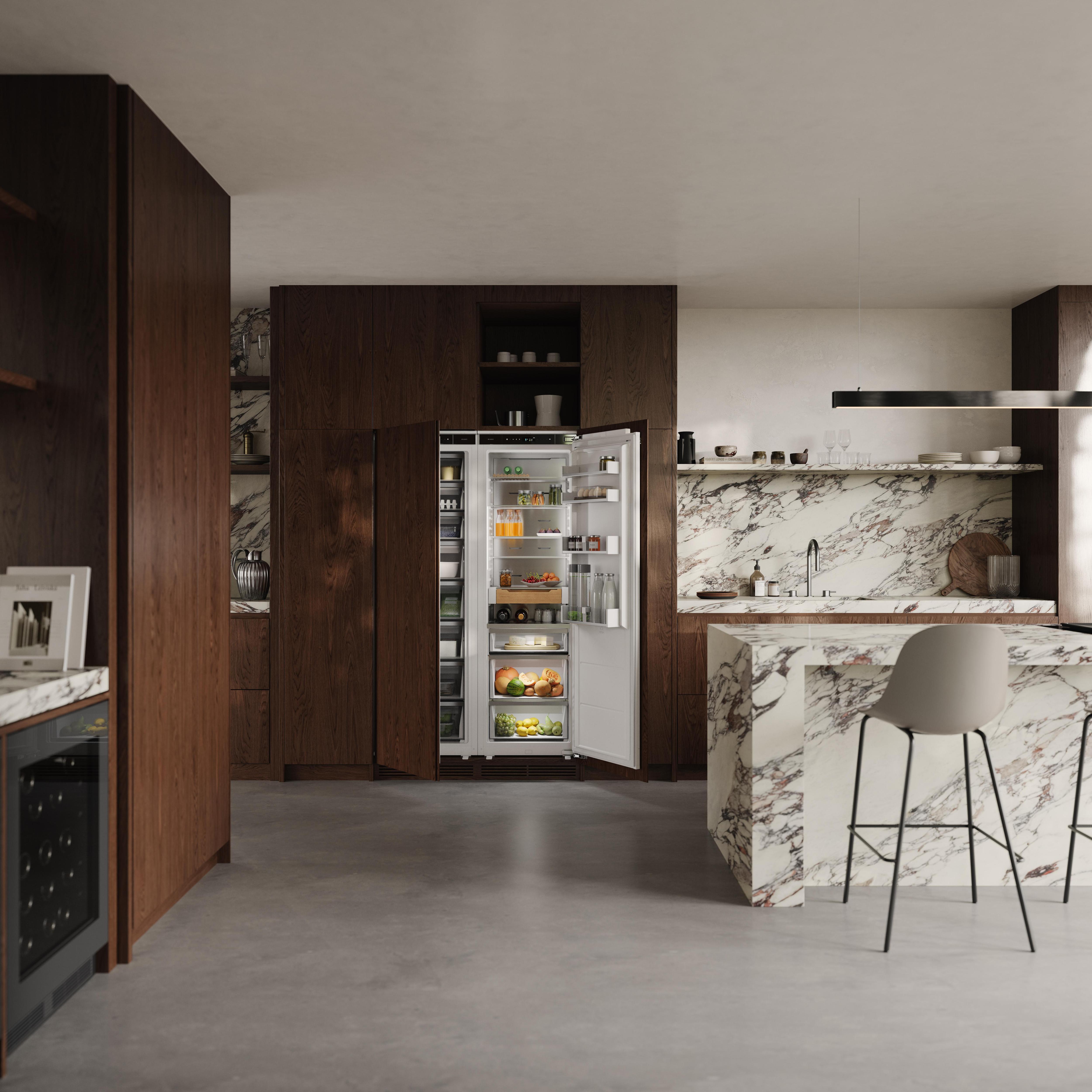Холодильники Nordic Fresh 2.0.Бренд предлагает два подхода к интеграции техники в кухню. Встраиваемые модели становятся невидимым продолжением мебели, обеспечивая идеальный микроклимат для хранения продуктов. Отдельностоящие модели тоже можно встраивать, их размеры идеально вписываются в стандартные ниши.