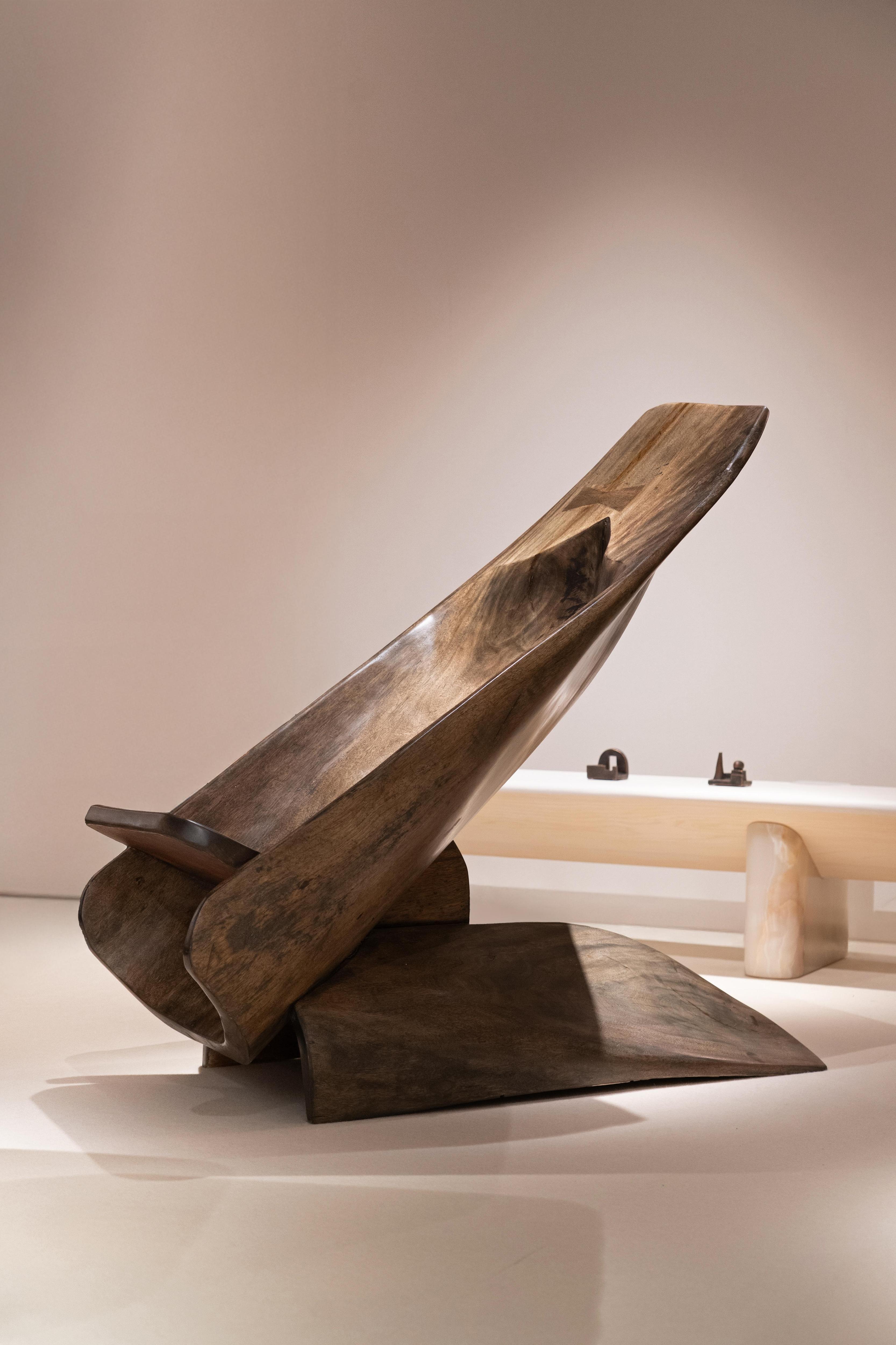 Стенд на PAD London объединил работы молодых авторов и творчество художников, с которыми сотрудничает Booroom Gallery. В центре экспозиции — работа бразильского архитектора, дизайнера и визионера Жозе Занина Калдаса. В этом году на выставке галерея представляет редкий предмет из его наследия — деревянное кресло Canoa серии Móveis Denúncia («Мебели протеста») 1970-х годов, которое несет в себе мощный нарратив о ремесле и сопротивлении.