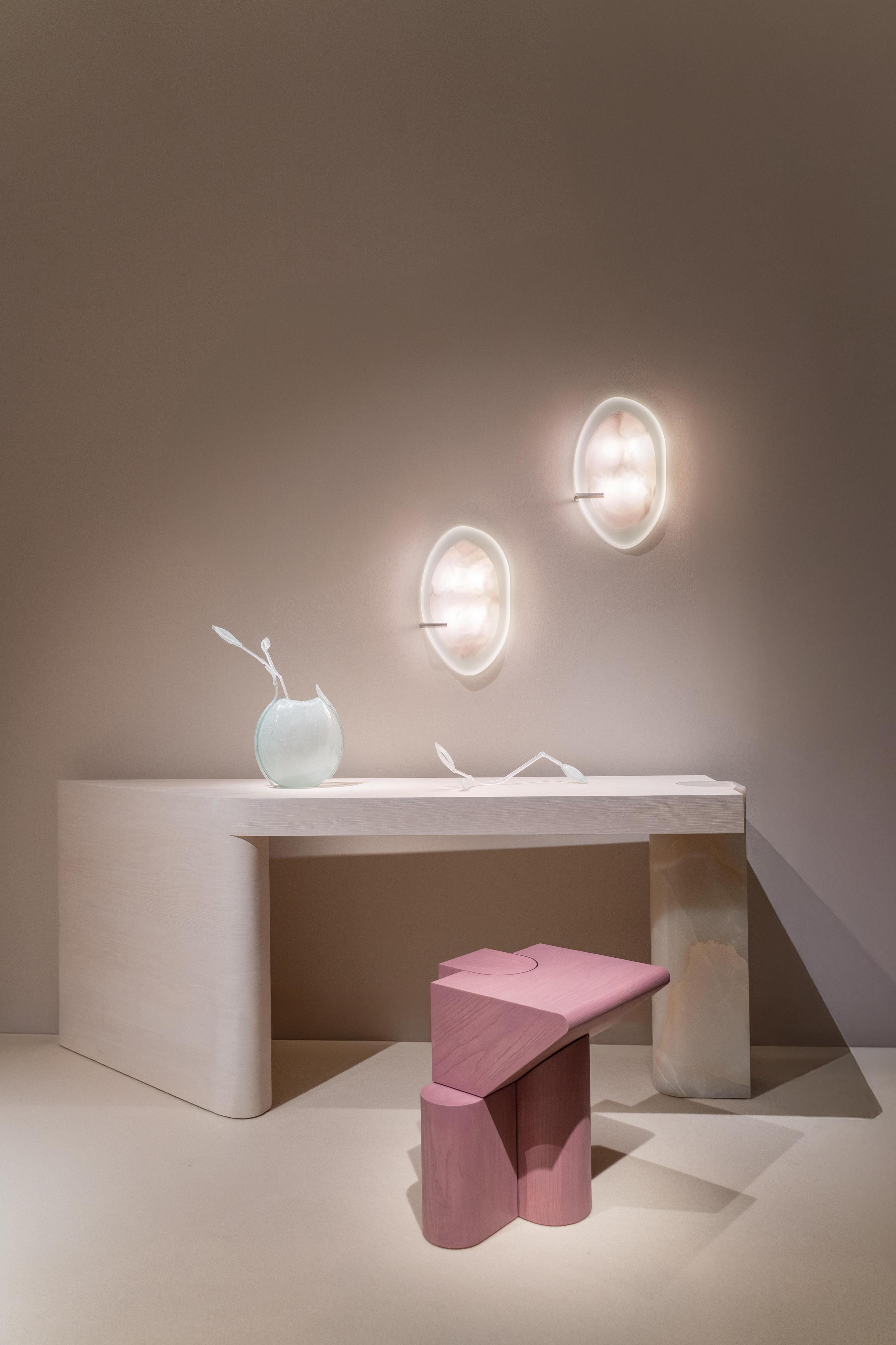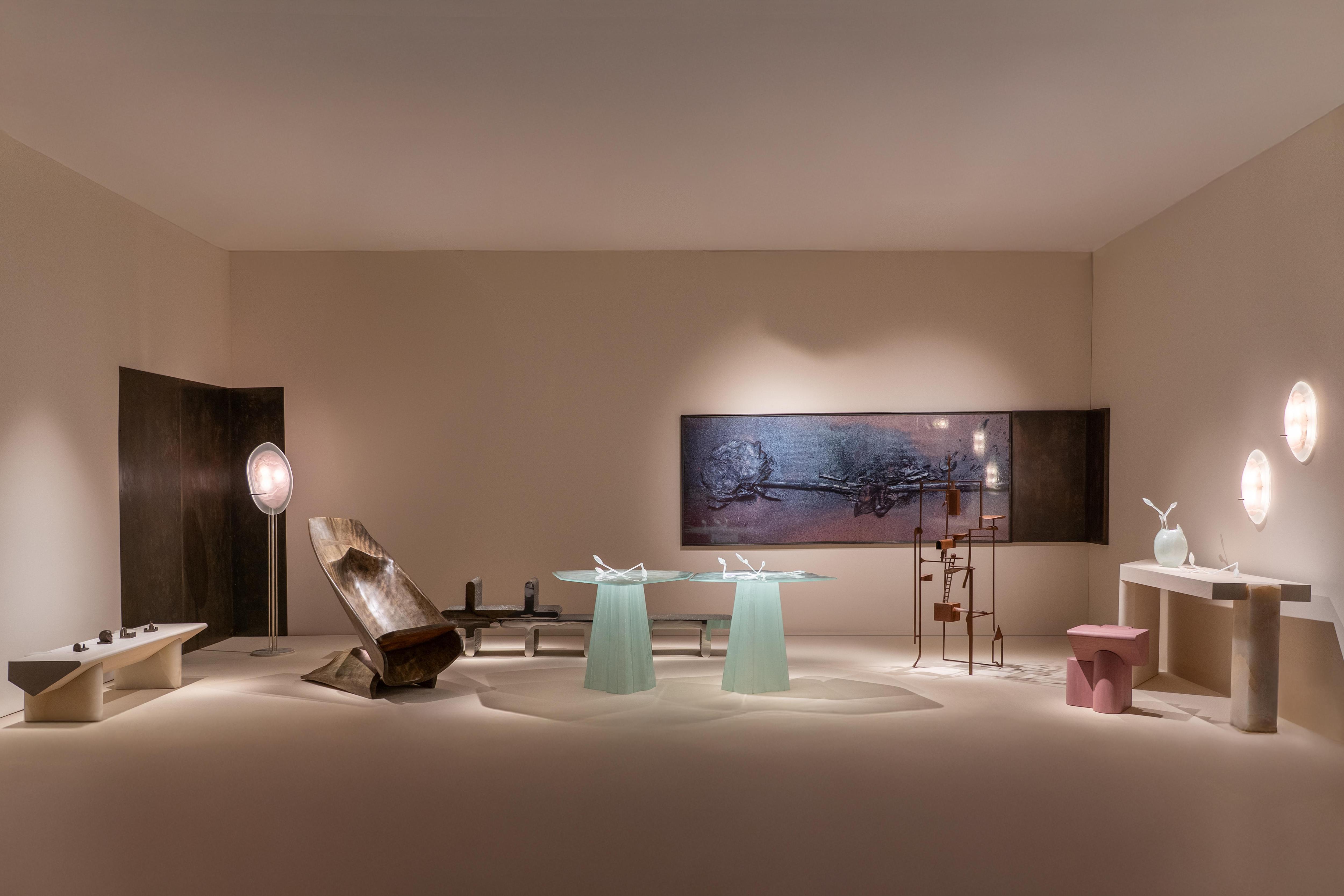 На стене световые скульптуры La Lune Арианы Ахмад. Консоль и столик Шарля Калпакиана. Стеклянные объекты Ксении Брейво.