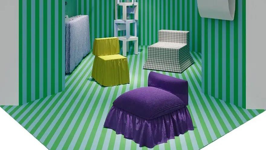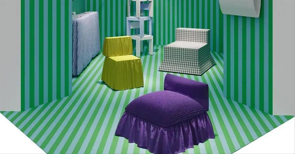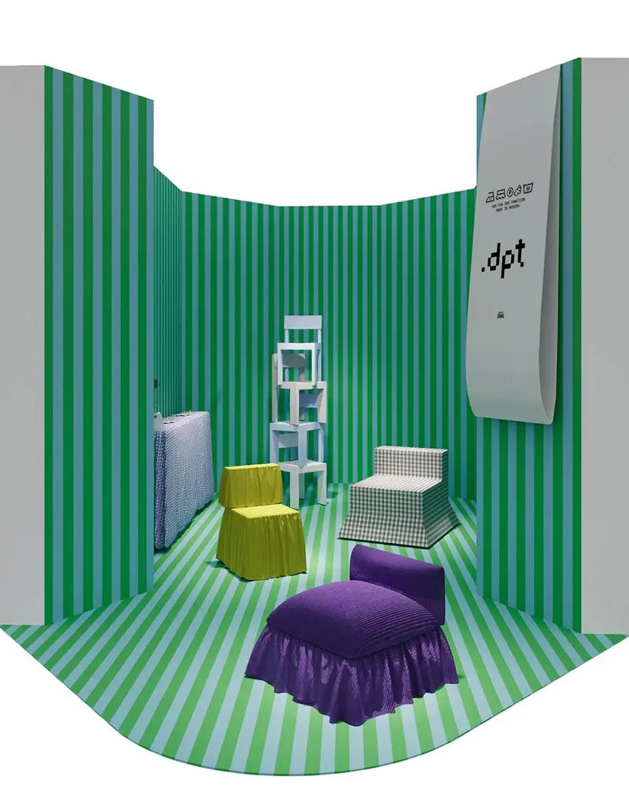 Бюро .dpt с иронией обыгрывает ретро-романтику 1980-1990-х. В полосатом павильоне они создадут уютную гостиную с театральным настроением, где кресло Chic Lounge с «юбкой» и стулья в текстильных чехлах стоят в окружении стен и пола в широкую цветную полоску.