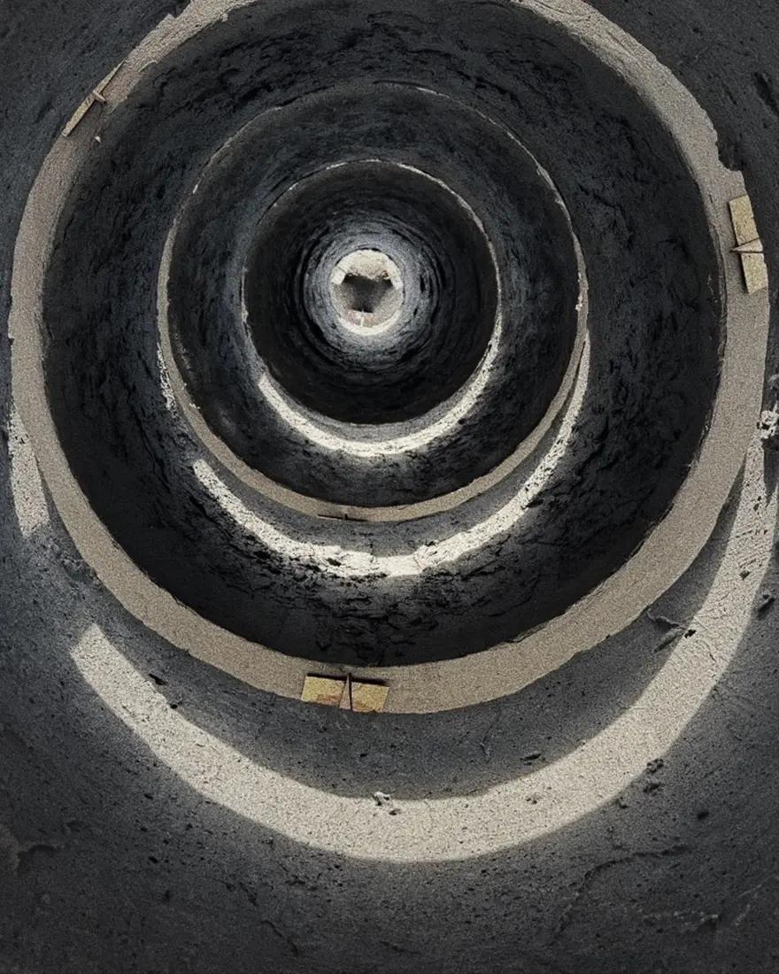 Освещение здесь — главный мотив, который создает восприятие и атмосферу пространства. Свет проникает внутрь бетонного павильона через проемы, щели и отверстия, задавая причудливую игру светотени.