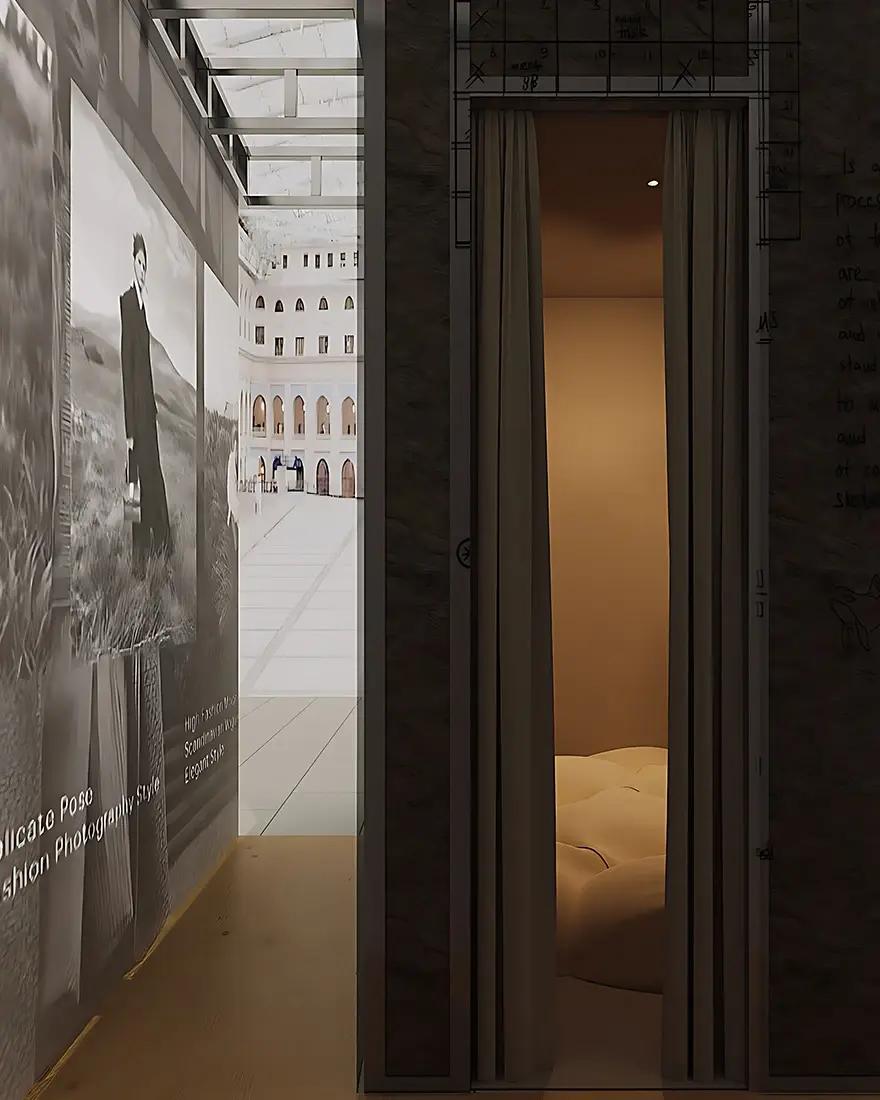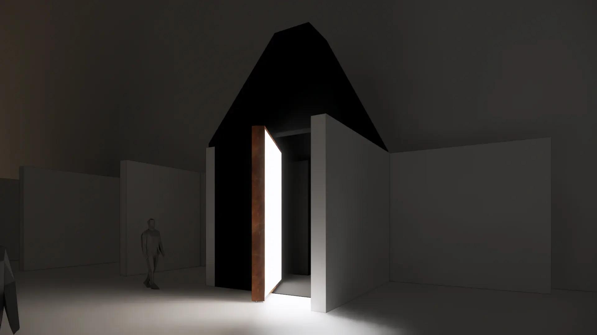 Команда ZROBIM architects построит «архитектуру смыслов» в виде черного куба с приоткрытой дверью — льющийся изнутри свет приглашает войти и символизирует диалог интерьера и эмоций зрителя.