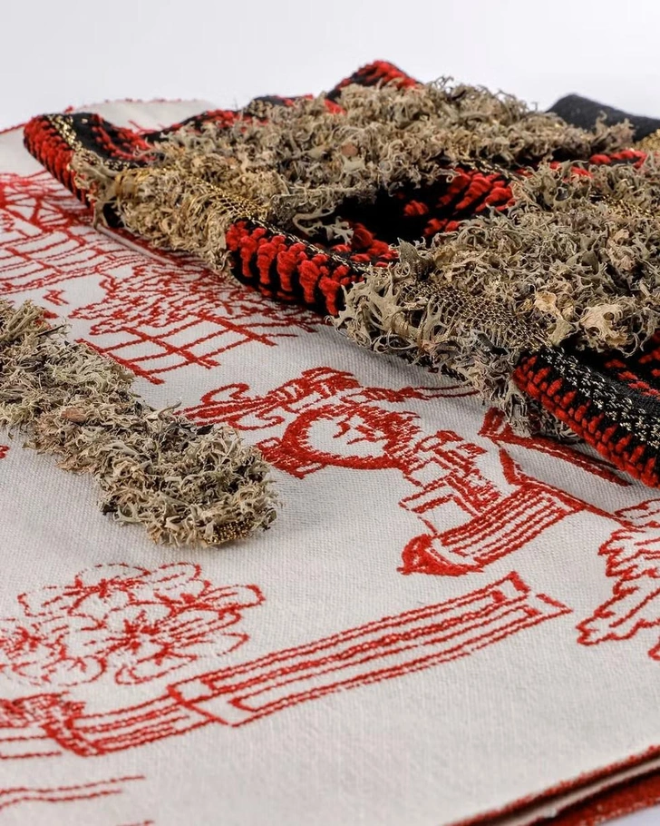 Работы студентки Клэр Дафни Деффик Олдани — это глубоко личные текстильные исследования, в которых материал становится носителем культурной памяти и идентичности. Дизайнер создает сложные композиции, интегрируя в ткань органические элементы — лишайники, кожуру овощей, — которые выступают символическими маркерами конкретных мест и практик. Ее метод синтезирует традиционное ручное ткачество, работу с регенерированными материалами и цифровой дизайн.