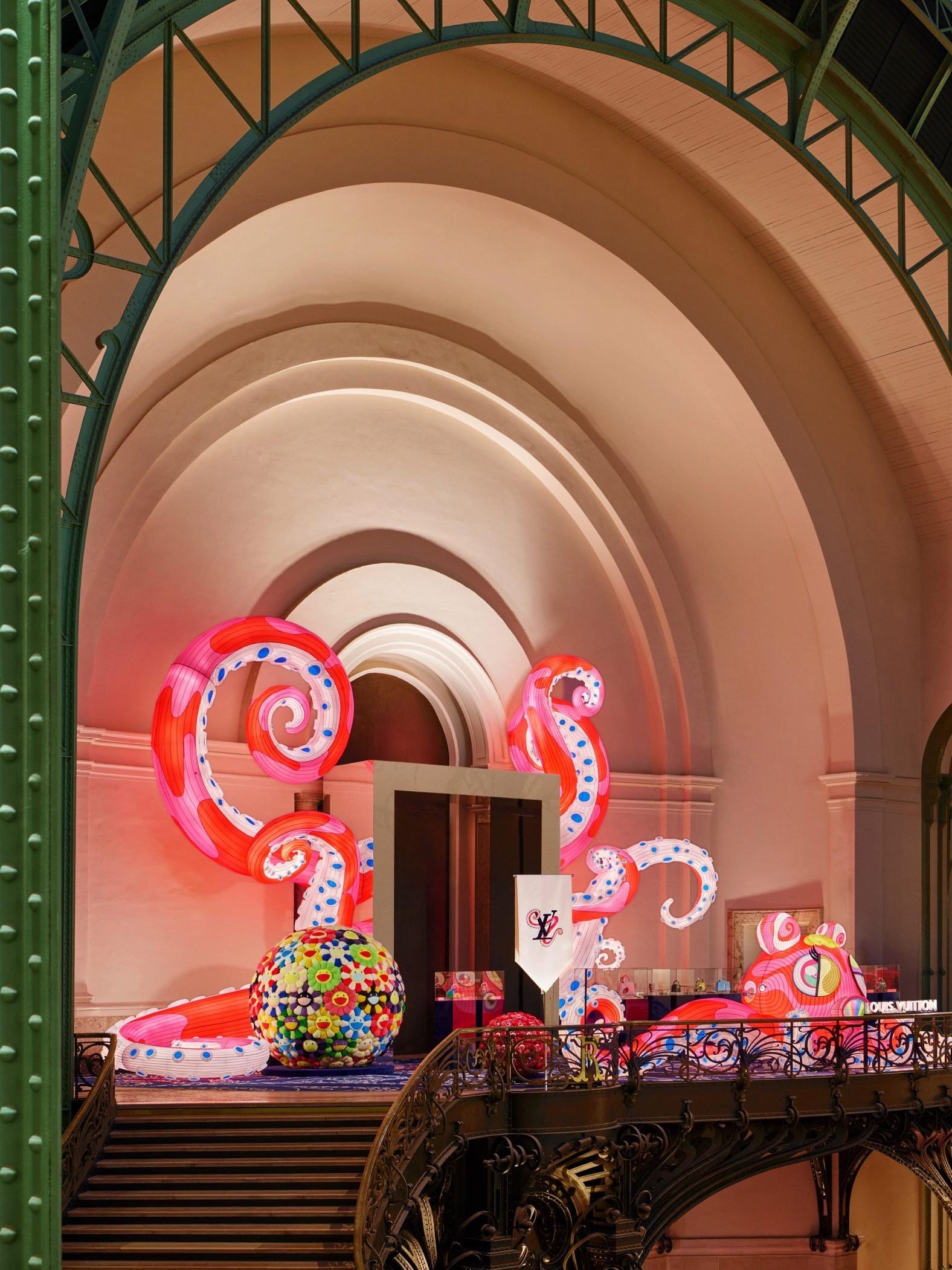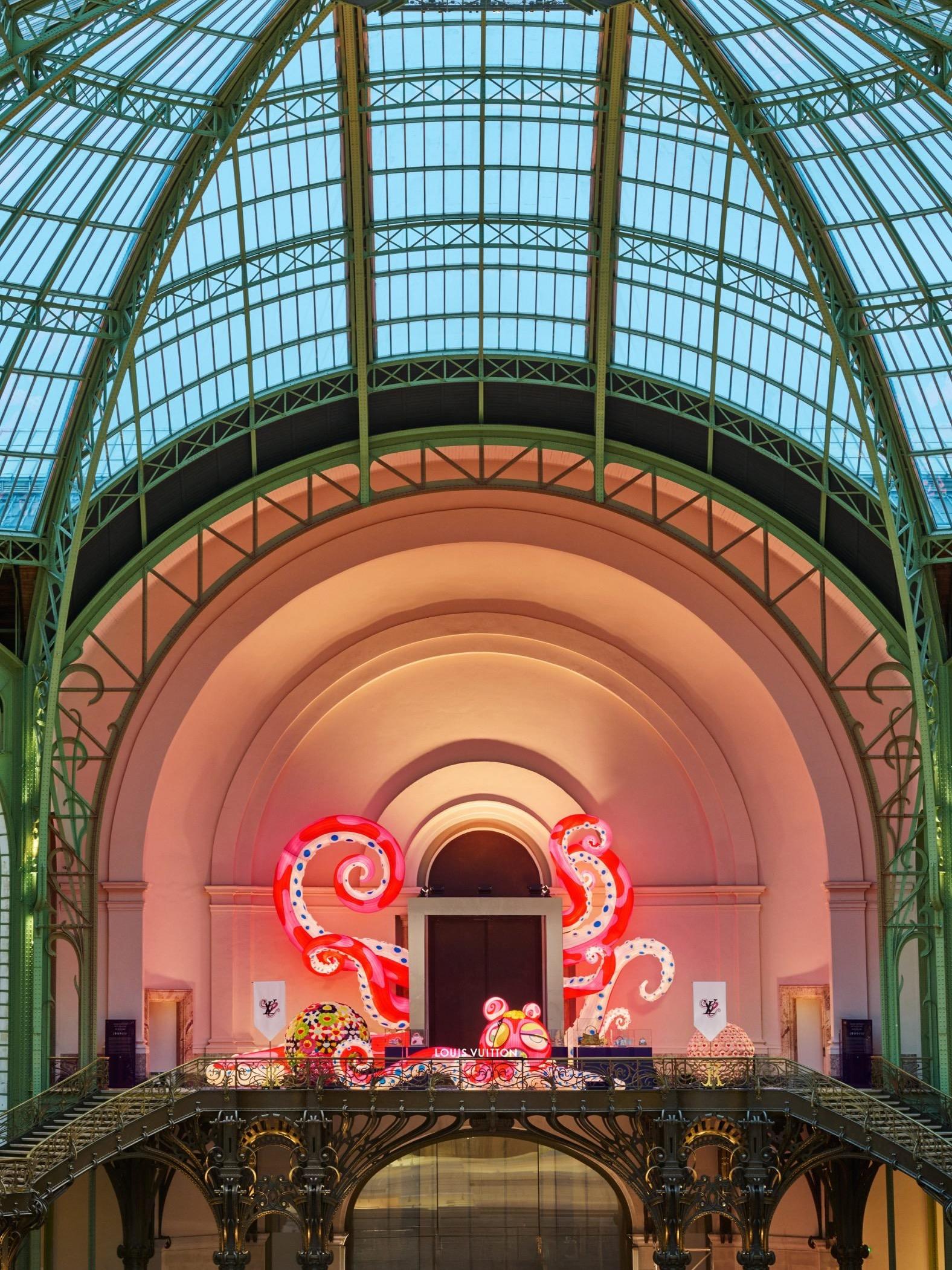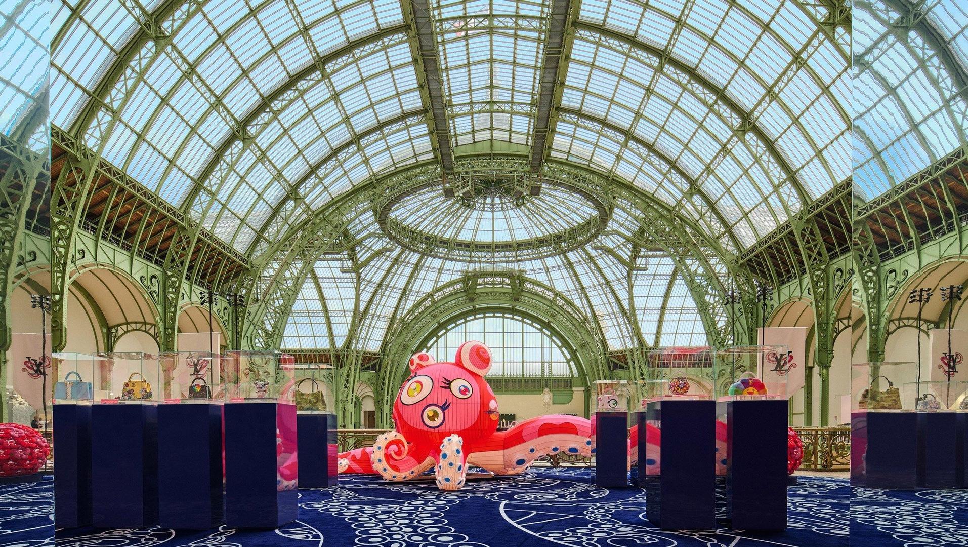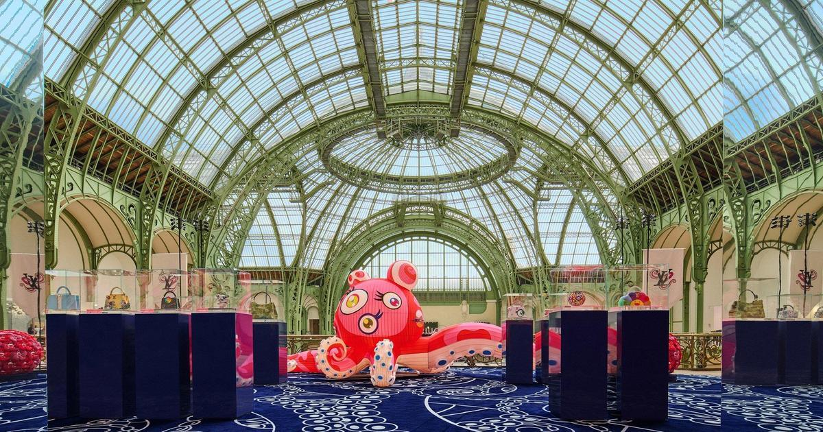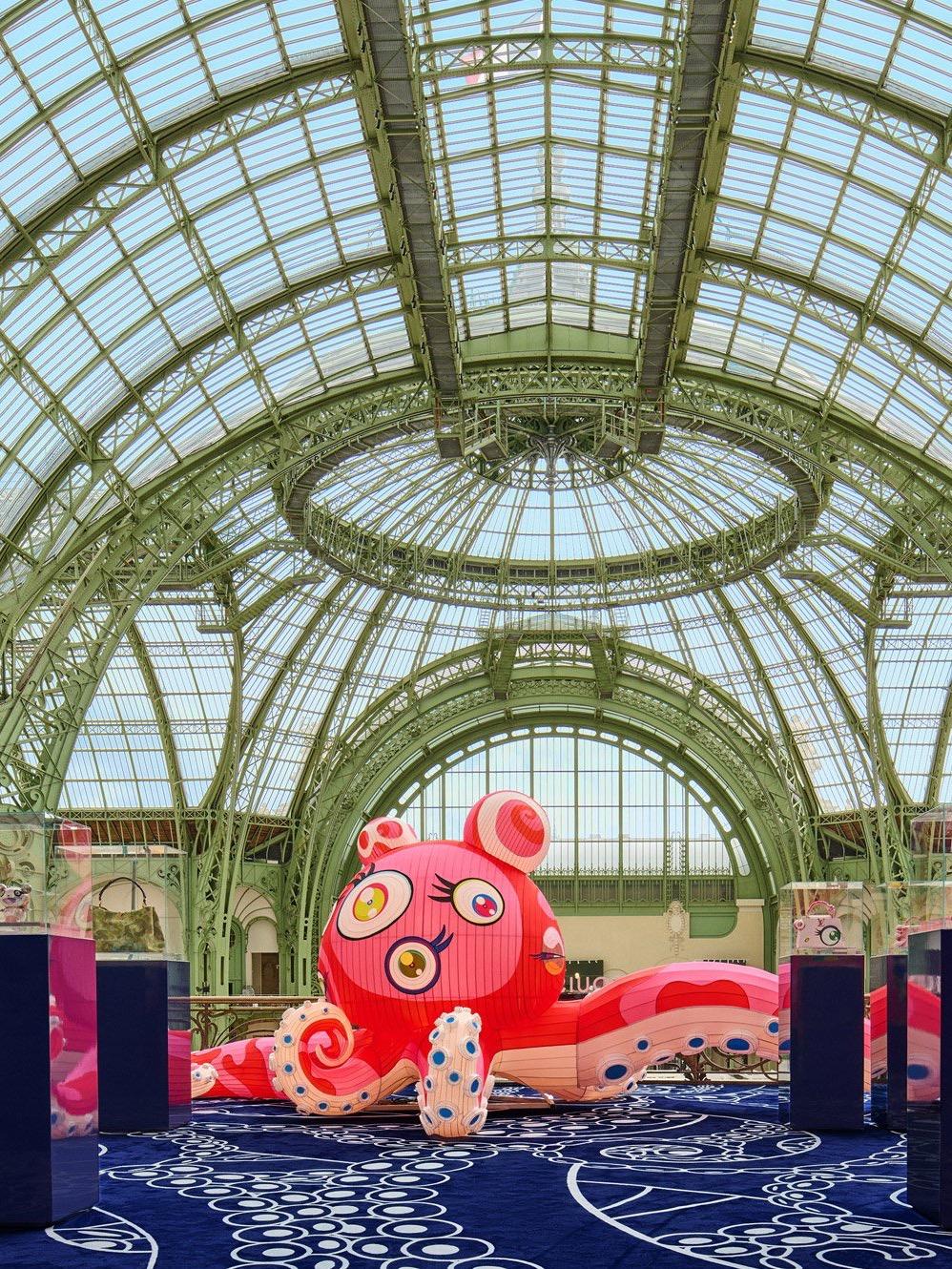 В выставочном центре Гран-Пале в Париже, где сейчас проходит выставка Art Basel, появилась огромная надувная фигура осьминога. Инсталляцию установили компания Louis Vuitton и художник Такаси Мураками в честь выхода новой совместной коллекции.