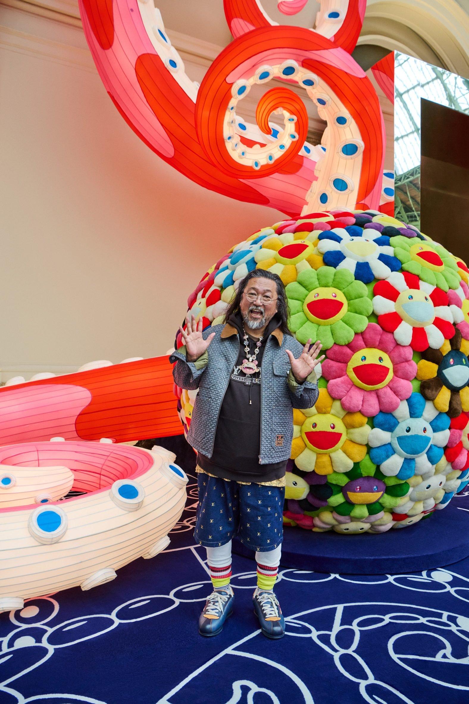 В Гран-Пале также представлены эскизы Такаси Мураками, сумки из новой коллаборации с Louis Vuitton, а также три большие сферы, украшенные разноцветными плюшевыми цветами.