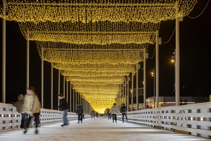 Грандиозный ледовый комплекс — один из самых длинных линейных катков в России — протянулся на 1,7 км вдоль живописной набережной Москвы-реки под сиянием гирлянд, образующих эффект парящего звездного неба. Впечатляющая подсветка создает эффект звездного неба: более 14 млн ламп и 72 световые полосы.