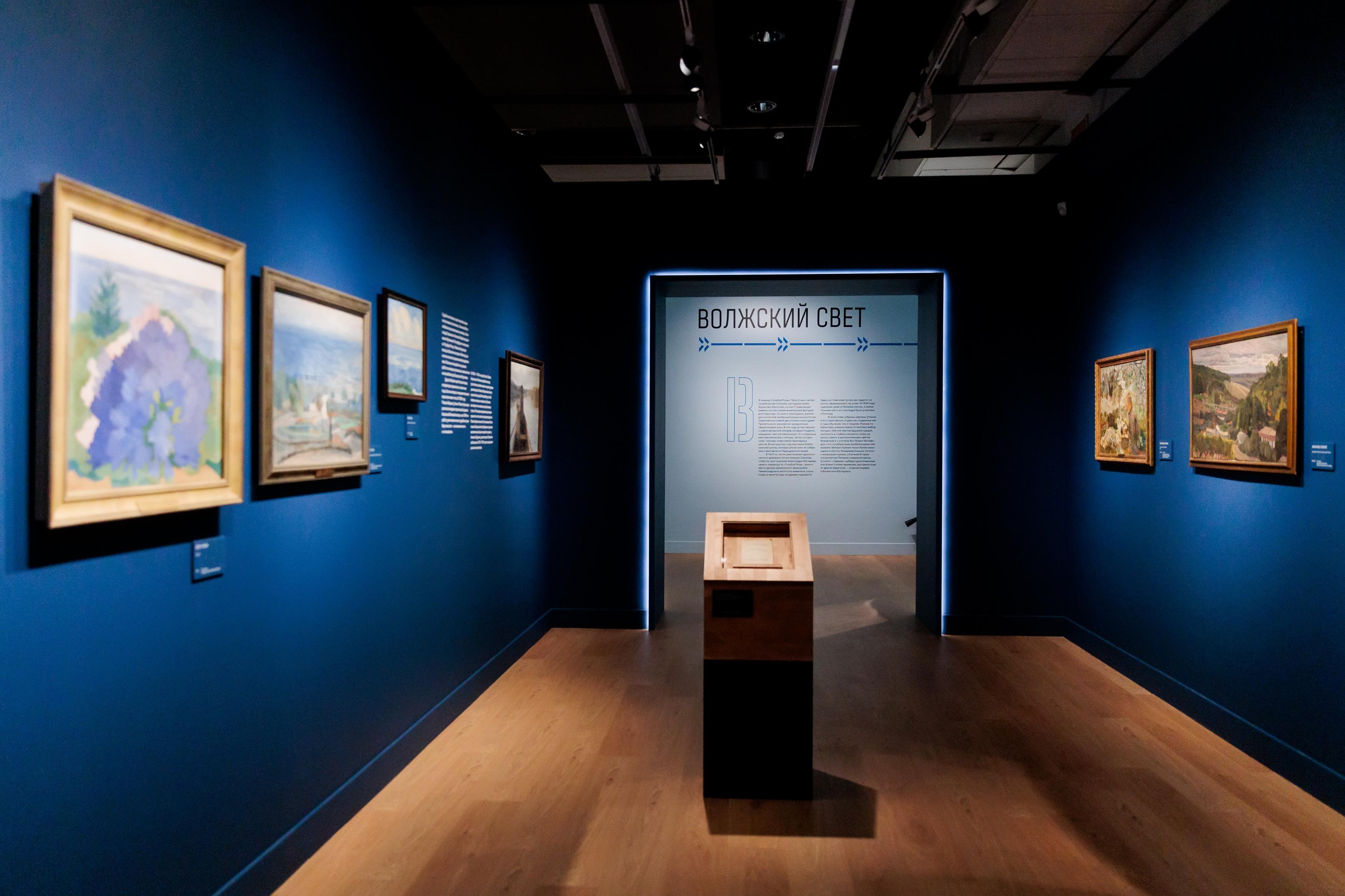 Зритель отправится в путешествие по Волге, Москве-реке и Неве, чьи пейзажи вдохновляли художников. Поэтому тут можно увидеть залы в лазурных, небесных, васильковых и кобальтовых тонах. Даже переезжая из города в город, саратовцы не изменяли сине‑голубой палитре. Но каждый раз она менялась вслед за большой водой, окружающей три этих города.
