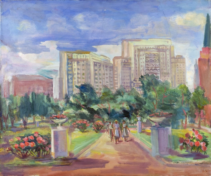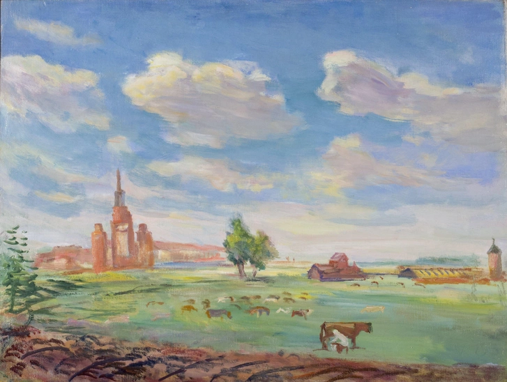 На выставке показана эволюция художников: от раннего проекта фресок для Казанского вокзала до московских пейзажей Павла Кузнецова 1950-х, где на фоне сельских видов высятся строящиеся сталинские высотки.