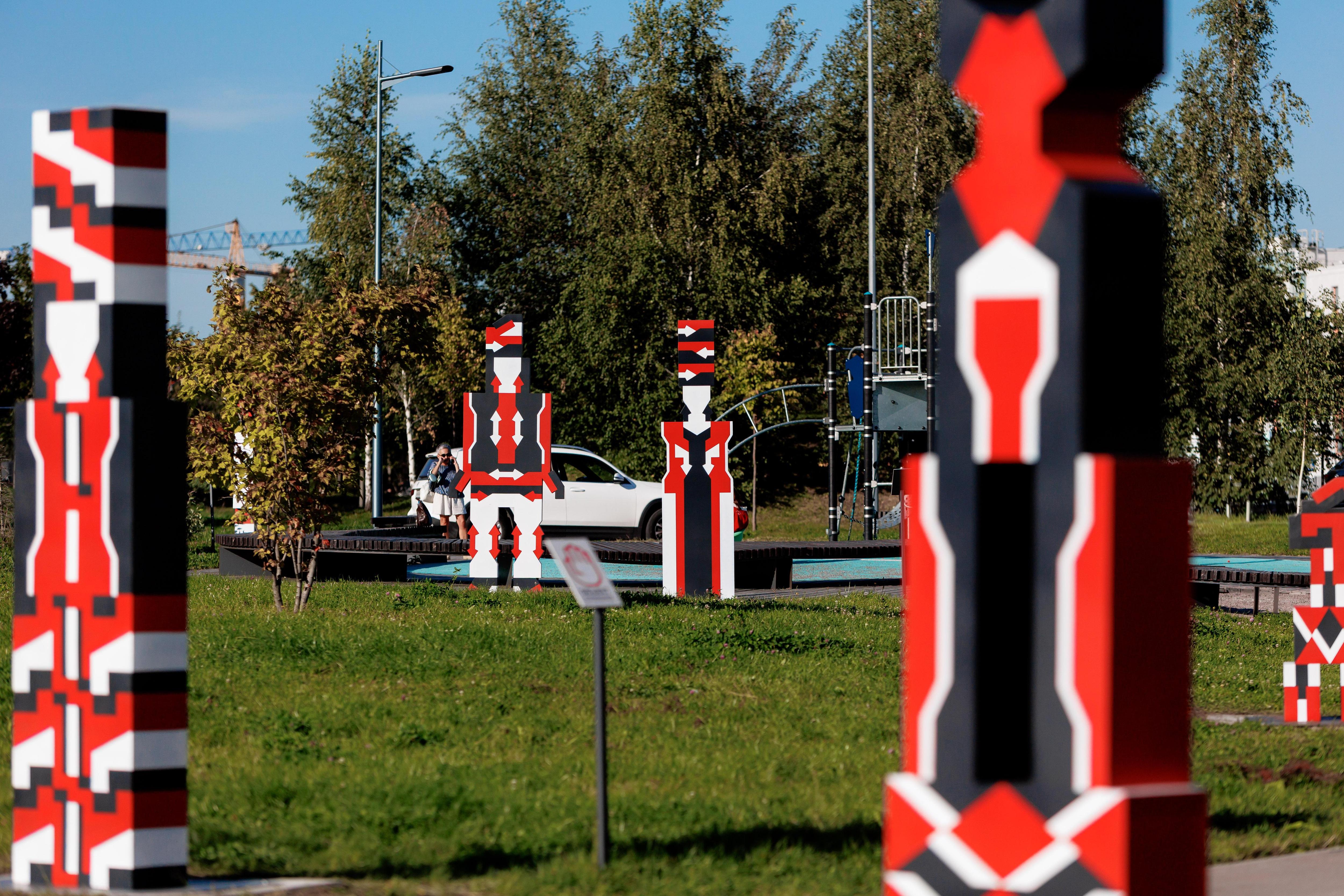 «Лет 10 назад я придумала визуальный язык — алфавит из 64 геометрических знаков. Алфавитяне, родившиеся из алфавита, — это история о далекой планете, некая мечта всех нас. Мечта о месте, где царит гармония, любовь, музыка, понимание. Тут все очень гармонично, потому что каждый знак построен по золотому сечению. Сама планета тоже сбалансирована, планетянам не нужны ни руки, ни глаза, они существуют на другом уровне, в другом измерении. Для скульптуры подобраны архетипические цвета авангарда — черный, белый, красный. Это основные цвета в русской культуре, что очень важно для меня», — объяснила концепцию проекта Диана Воуба.