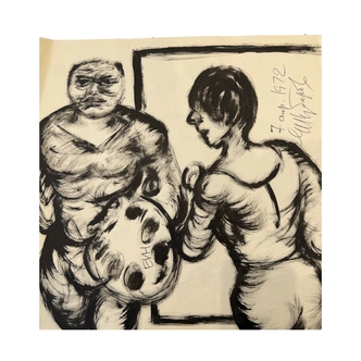 Вся выставка — и есть попытка ответить на этот вопрос. Ведь работы Чубарова очень яркие и узнаваемые: в них так много объема, как только может быть в графике. И это роднит его листы с эскизами будущих скульптур, словно вырубленных из гранита или базальта — все фигуры и предметы у Чубарова максимально выпуклы и обобщены до предела выразительности. В этой напряженной материальности проступает главная тема экспозиции — человек на границе познания, существующий между хаосом и структурой, архаикой и современностью.