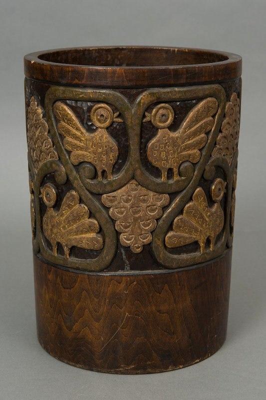 Кадушка. Художественно-столярная мастерская Московского губернского земства, Сергиев Посад, 1910-е. Дерево (липа), точение, резьба плоскорельефная, подкраска, тонировка, лакировка.