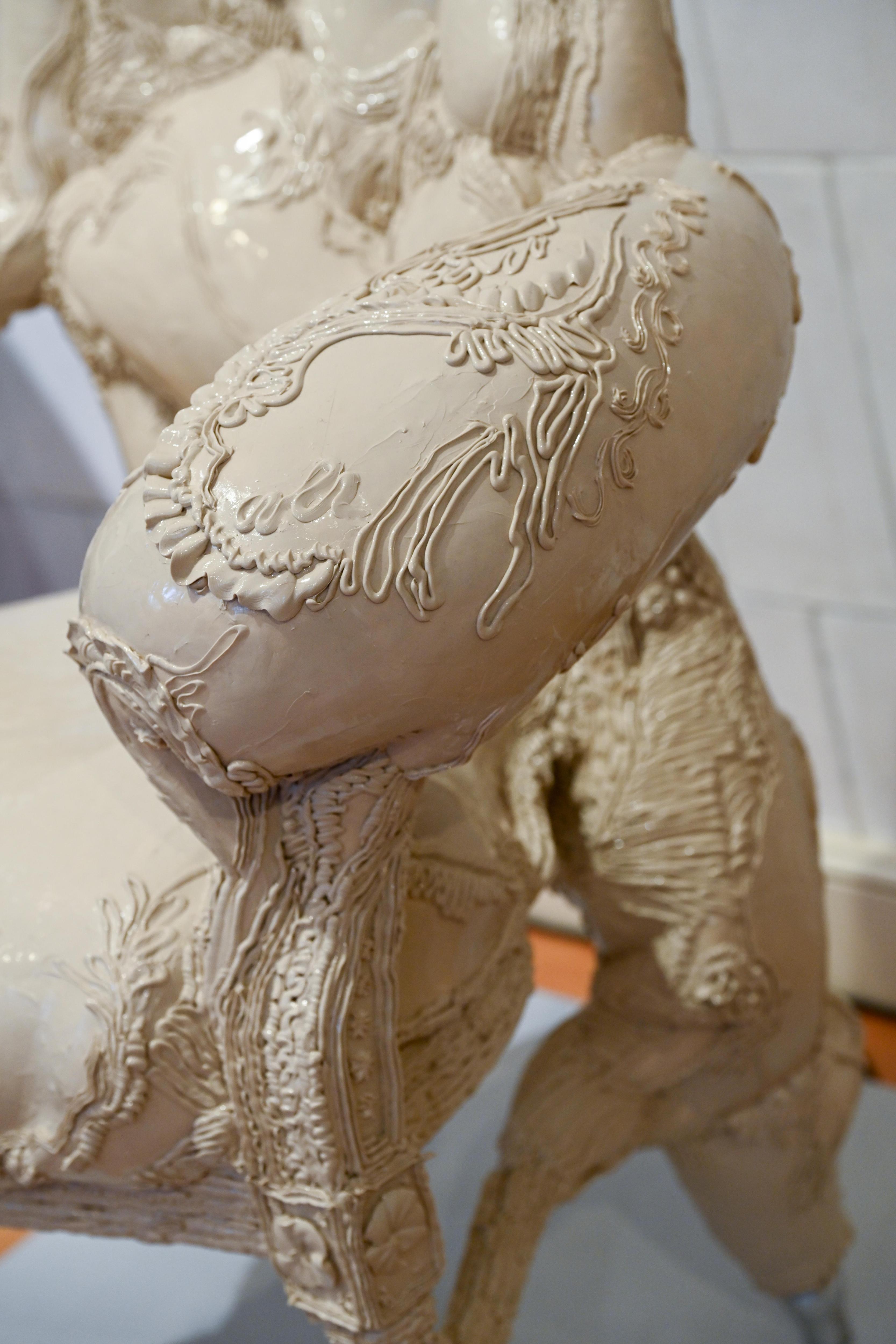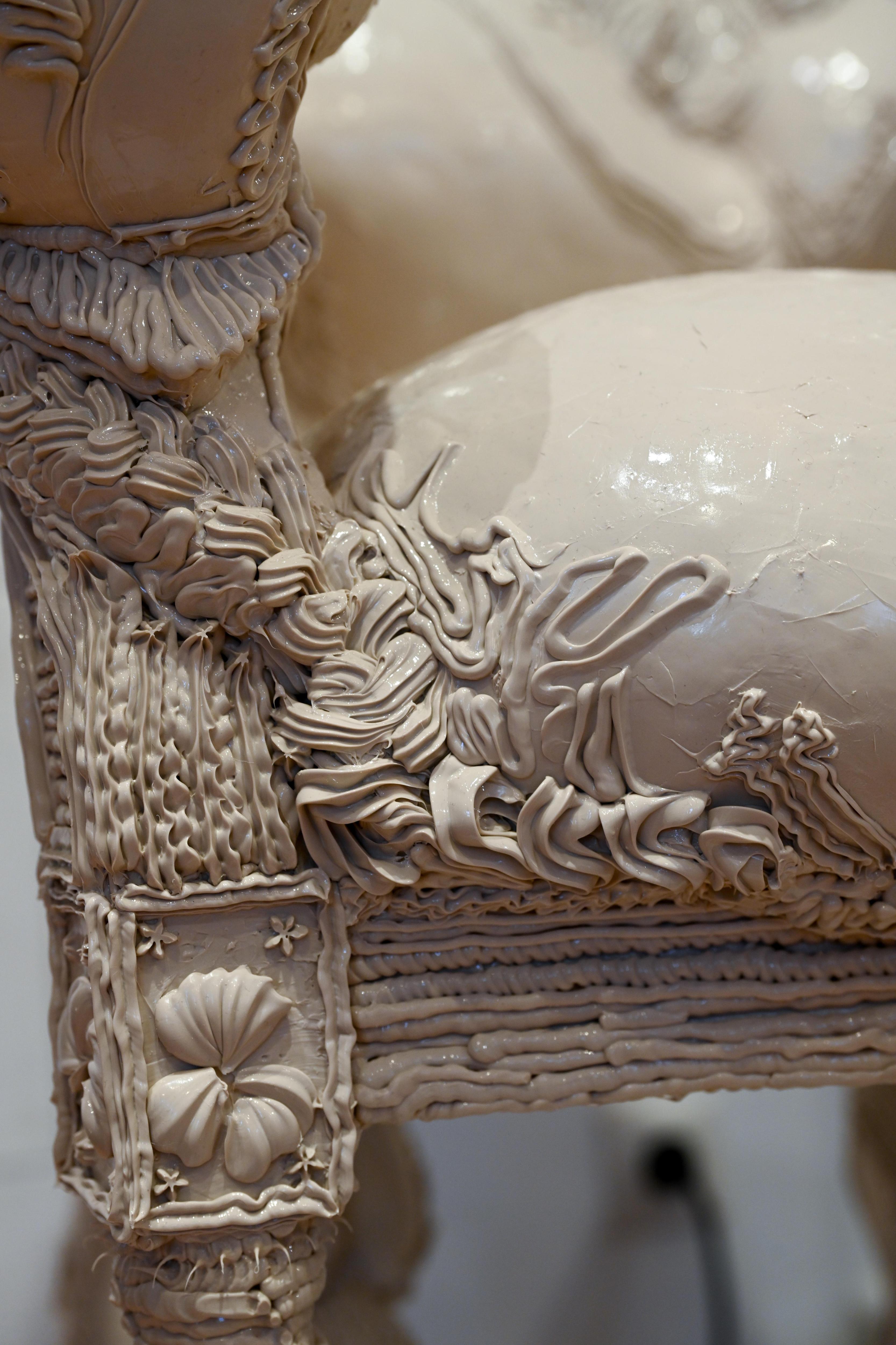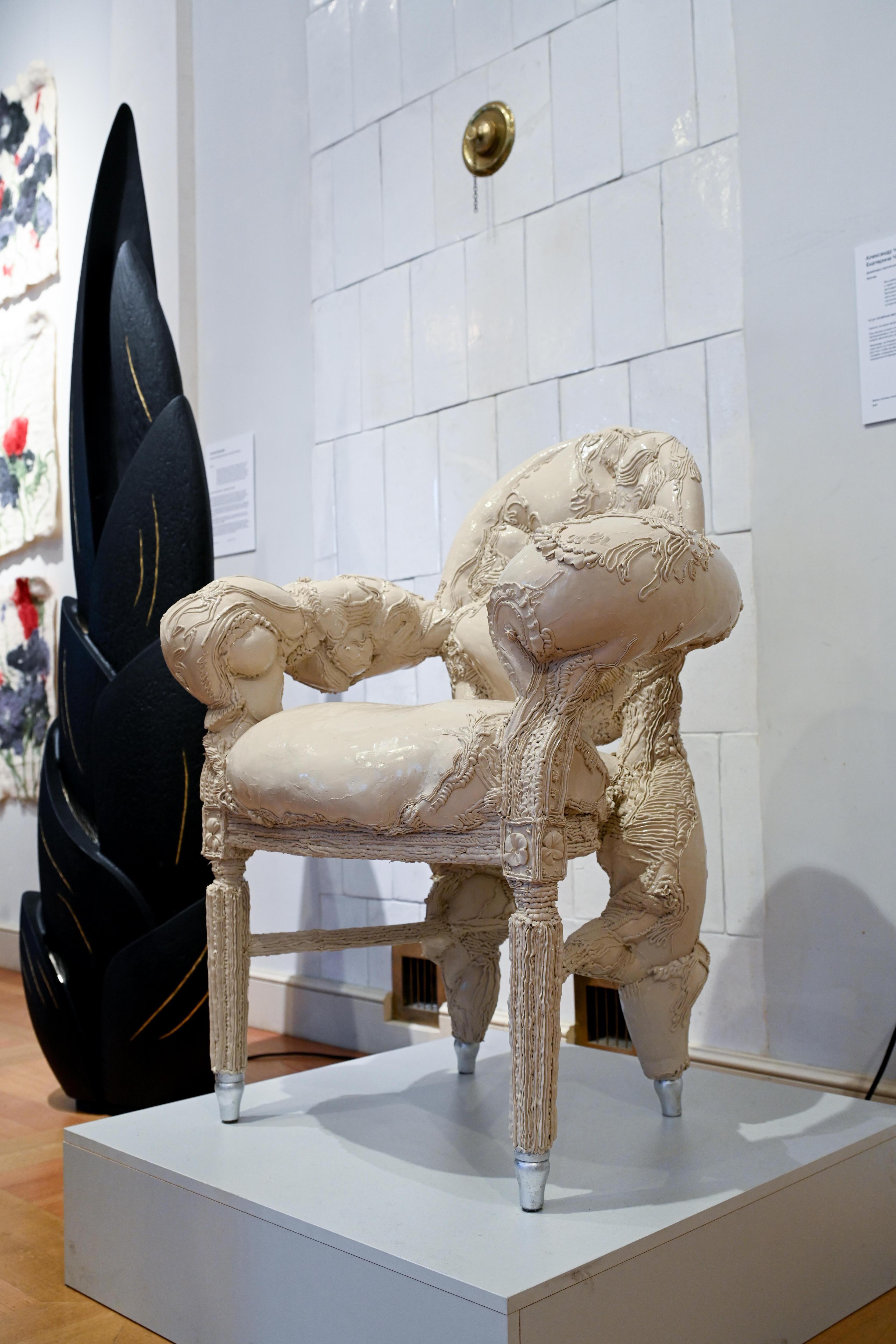 Удивило кресло «Хлебное место», созданное художниками Александром и Екатериной Чубарь из какого-то интересного мягкого материала похожего на опару. Моя бабушка из такого теста пекла когда-то пироги, и украшала их завитками. Очень хотелось на нем посидеть. Кстати, многие подходили, трогали со словами «Какой Колобок!». Я, как интерьерный дизайнер, с удовольствием поставила бы пару таких кресел в столовой. Это нечто реально новое, и при этом очень родное — из детства. Сразу понимаешь: ты в этом родился, в этом живешь, и ты это любишь.
