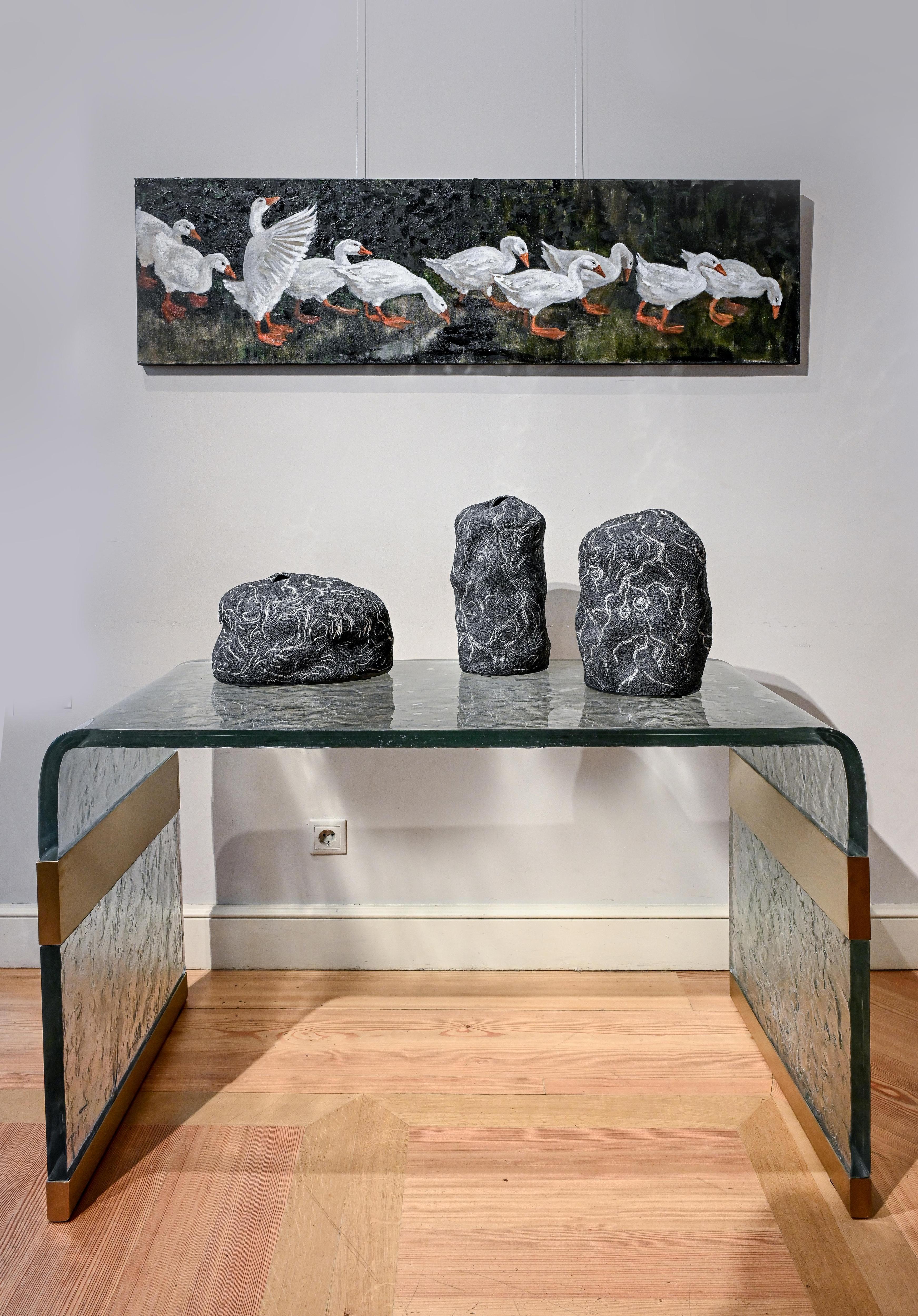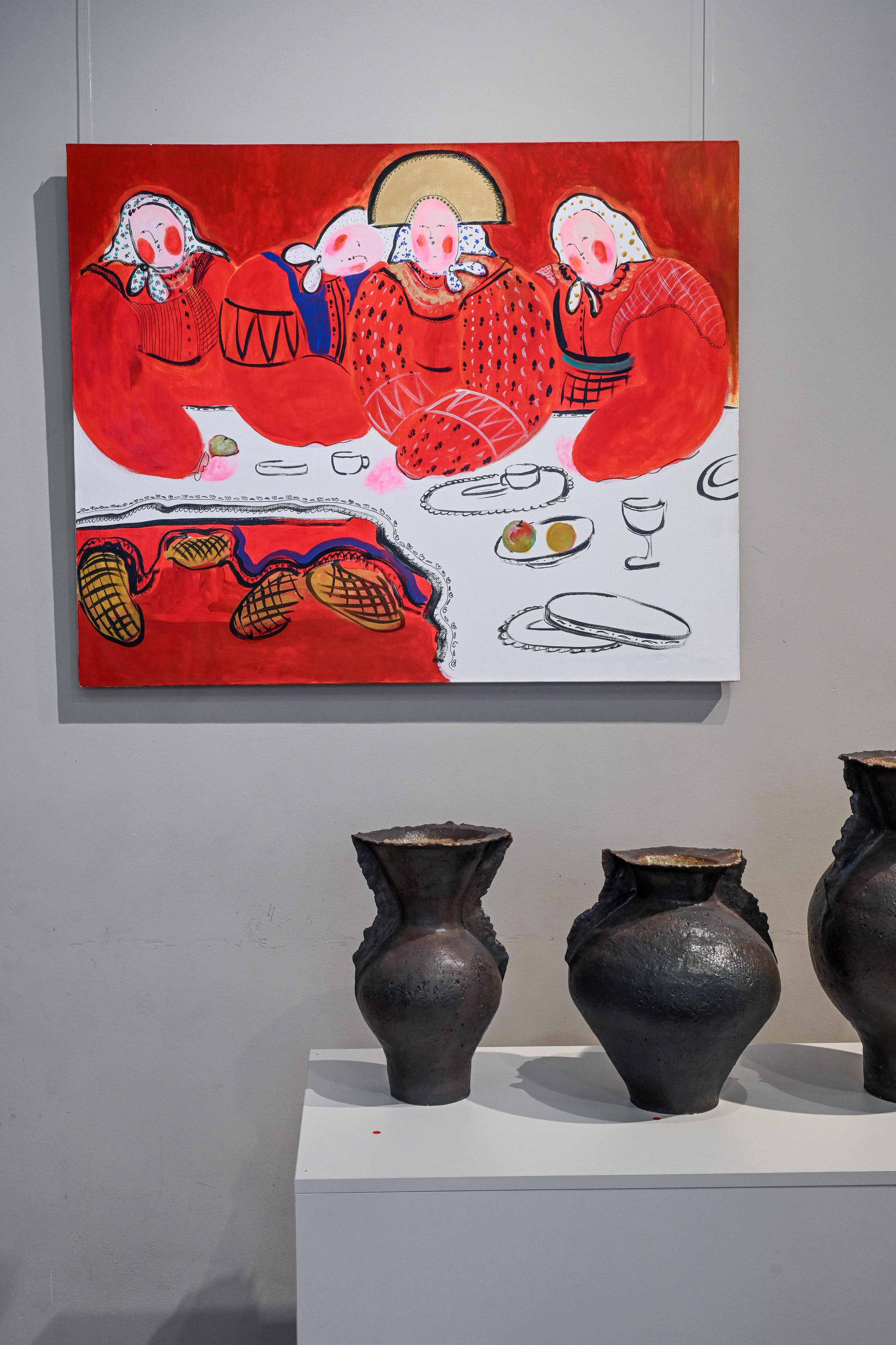 Картины с русскими бабами (диптих «Застолье» и «Пляс») художницы Дальяны Стрелковой: тут они пьют чай с баранками, тут то ли болтают, то ли пляшут. Мелкая керамика — бабы в бане, бабы в поле… То примитивизм в красно-белой гамме, то нечто мультипликационное. Все это Россия с женским лицом — иногда неожиданным.