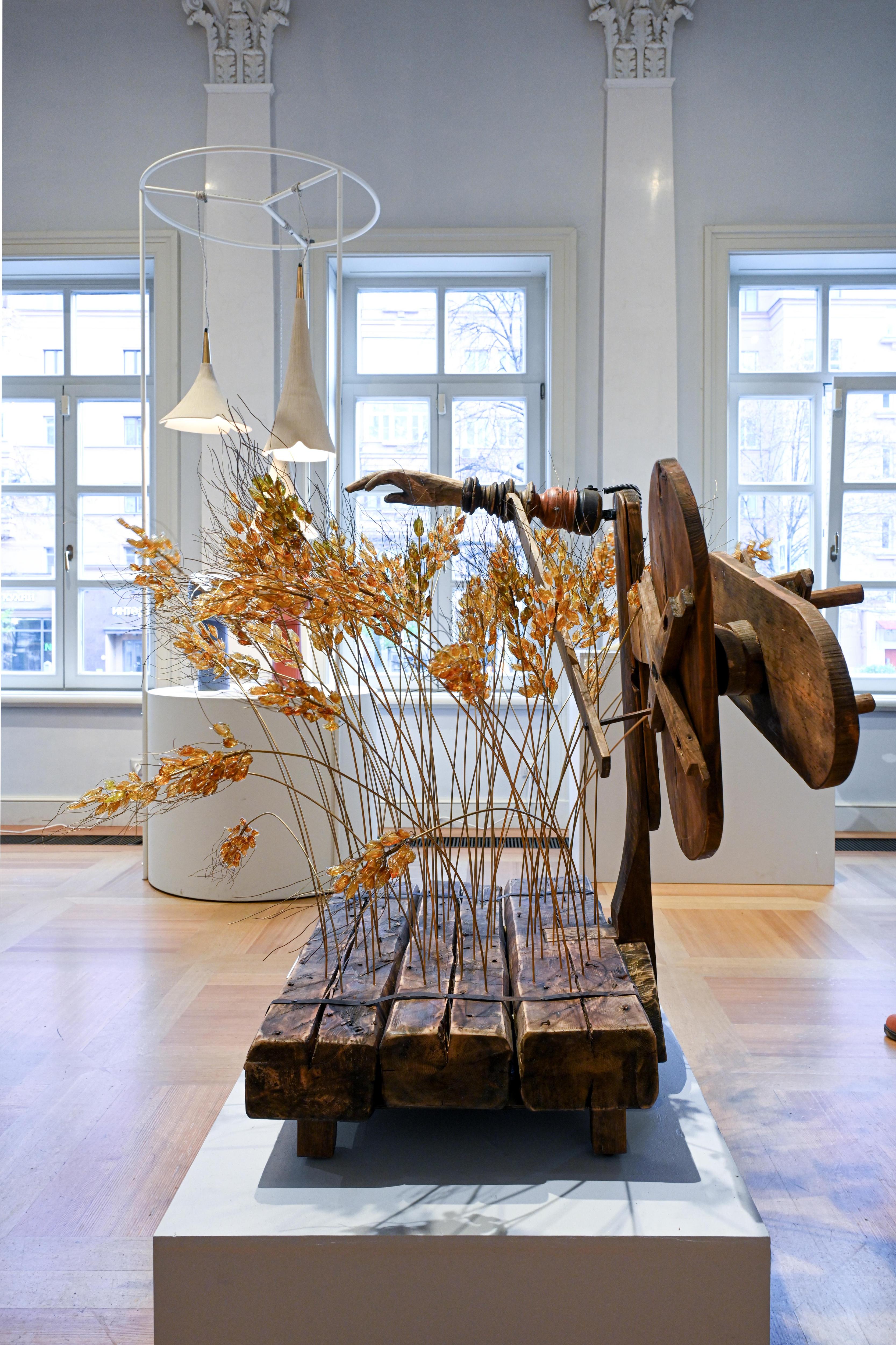 Над ними то ли часть прялки, то ли старинное колесо — когда его крутишь вдоль колосьев движется женская деревянная рука, вызывая к жизни много знакомых смыслов и образов. Хочется подойти и точно так же потрогать колосья ладонью, пошуршать. Авторы инсталляции, кстати, не запрещали.