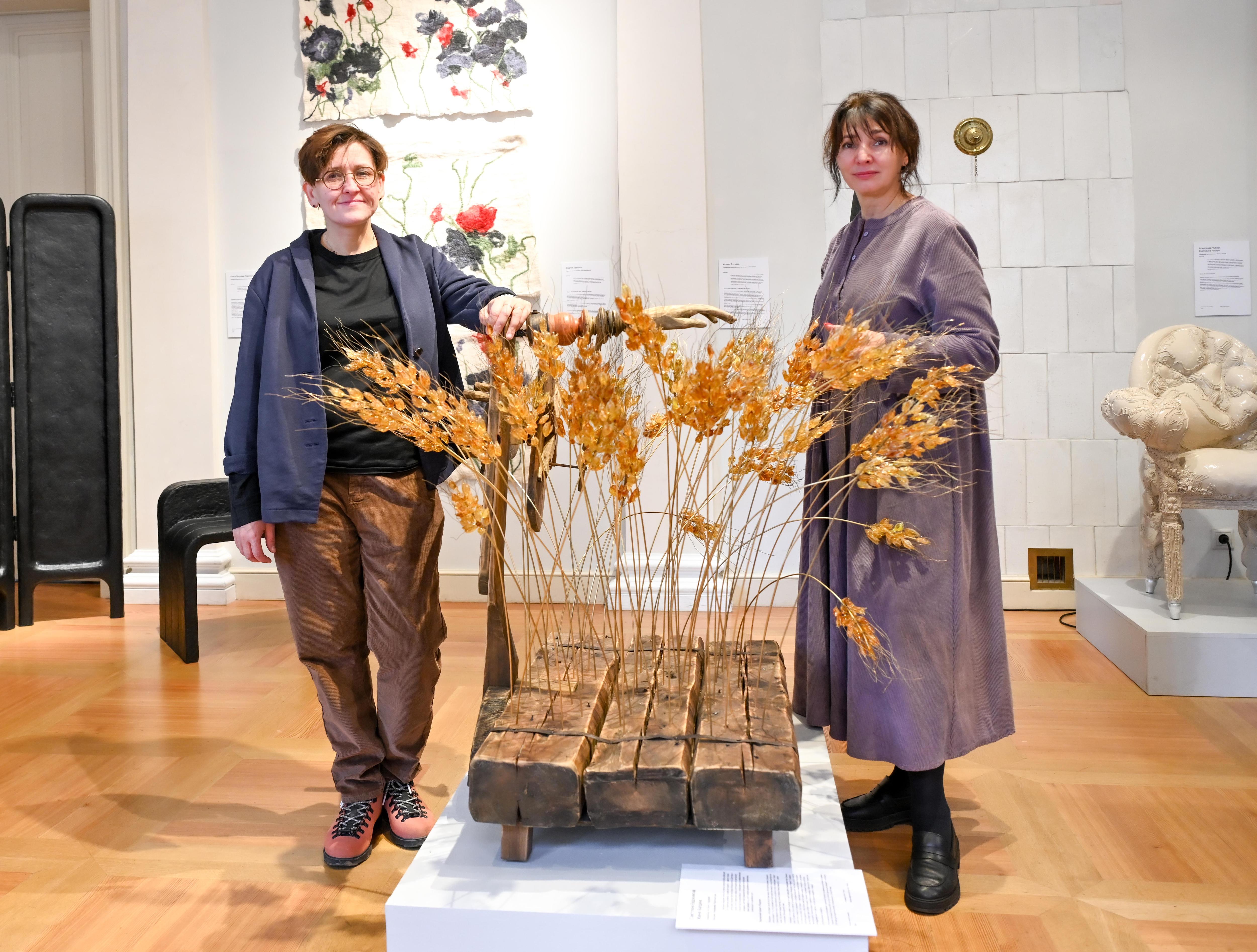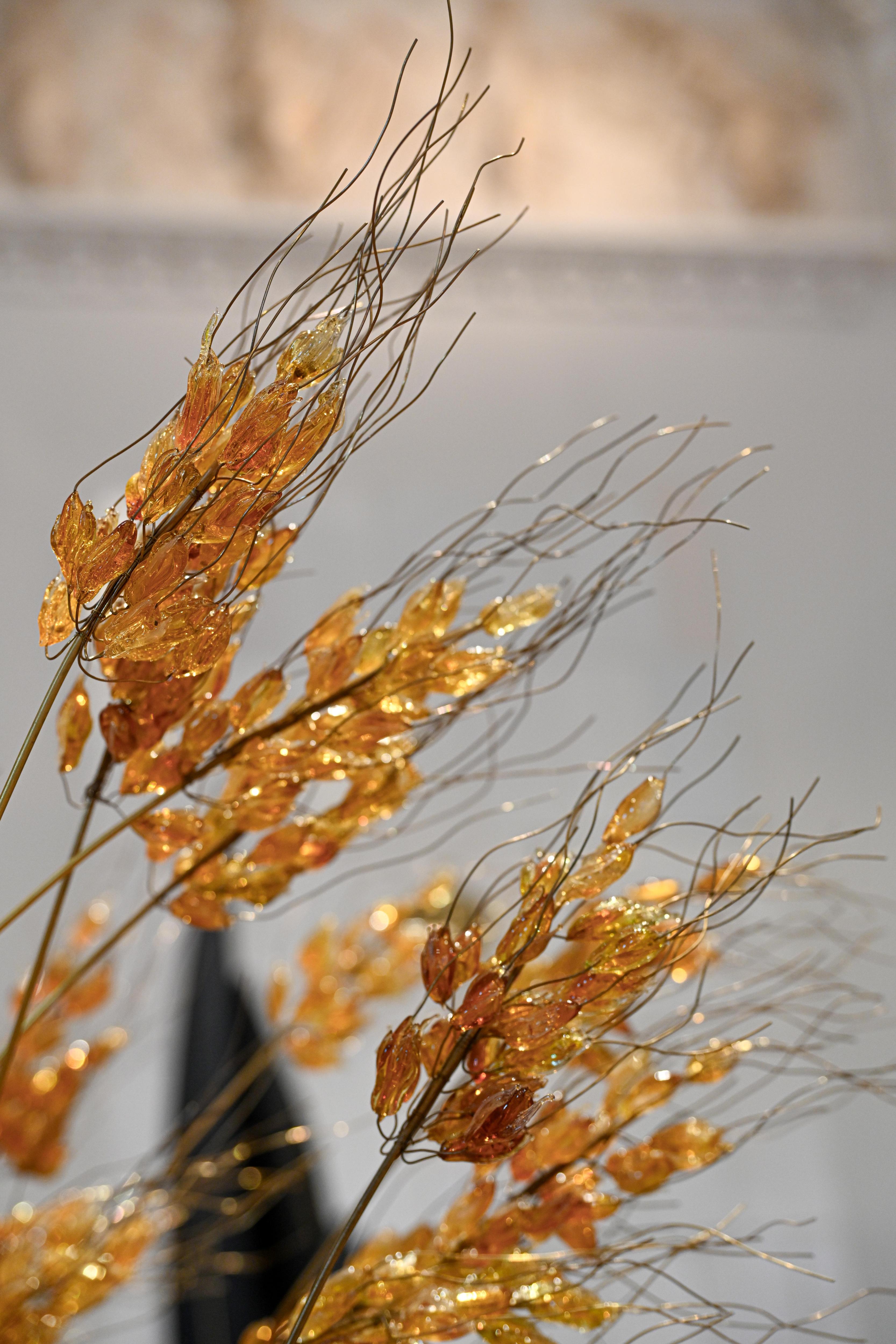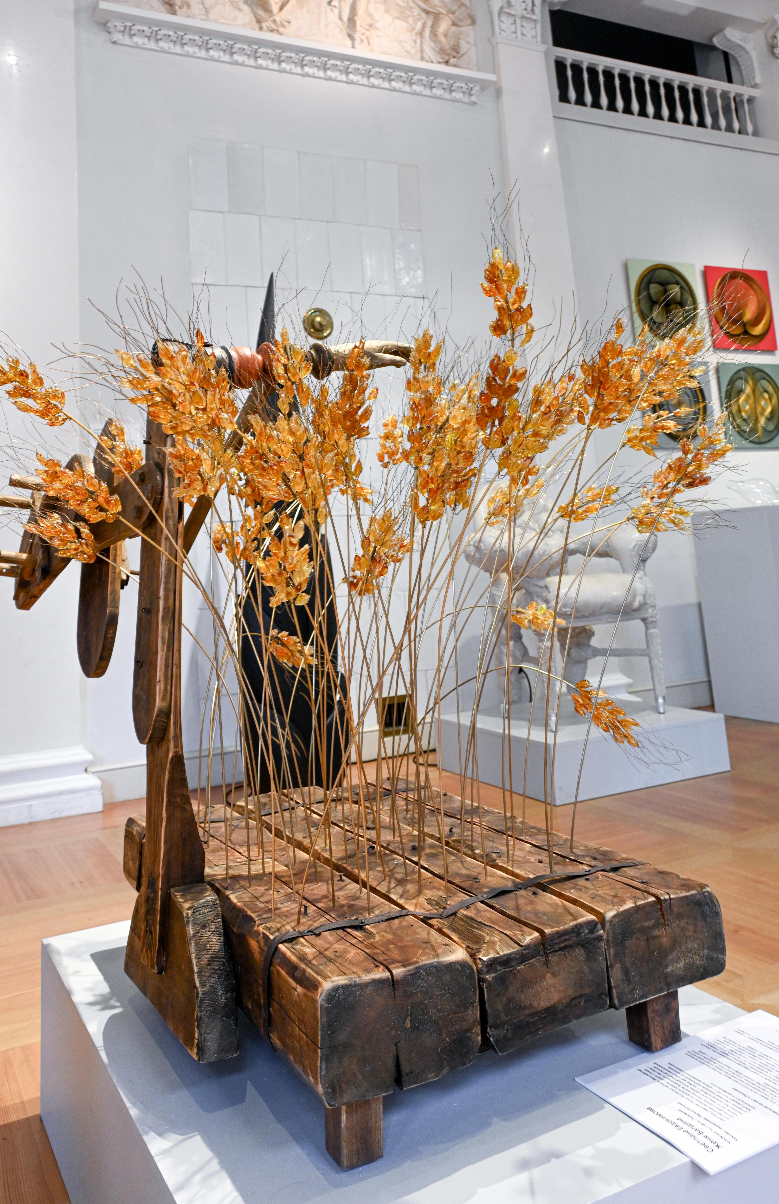 Запомнилась композиция с колосьями из стекла и металла в одном из первых залов выставки. Это работа под названием «Тишина» художниц Светланы Евдокимовой и Жени Балдиной. Зернышки сделаны вручную, а тонкие металлические стебли воткнуты в старинные деревянные брусья из какой-то усадьбы.
