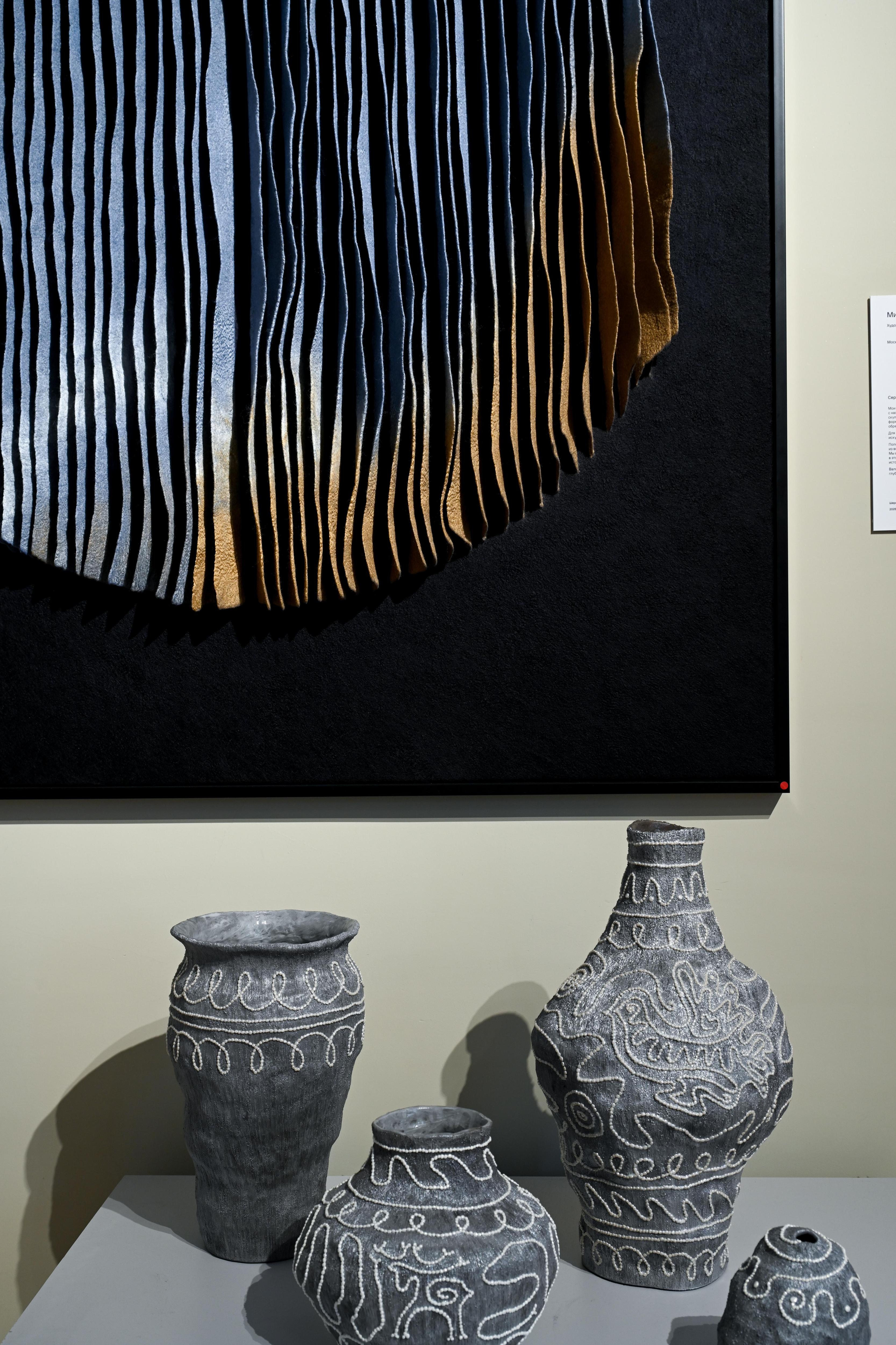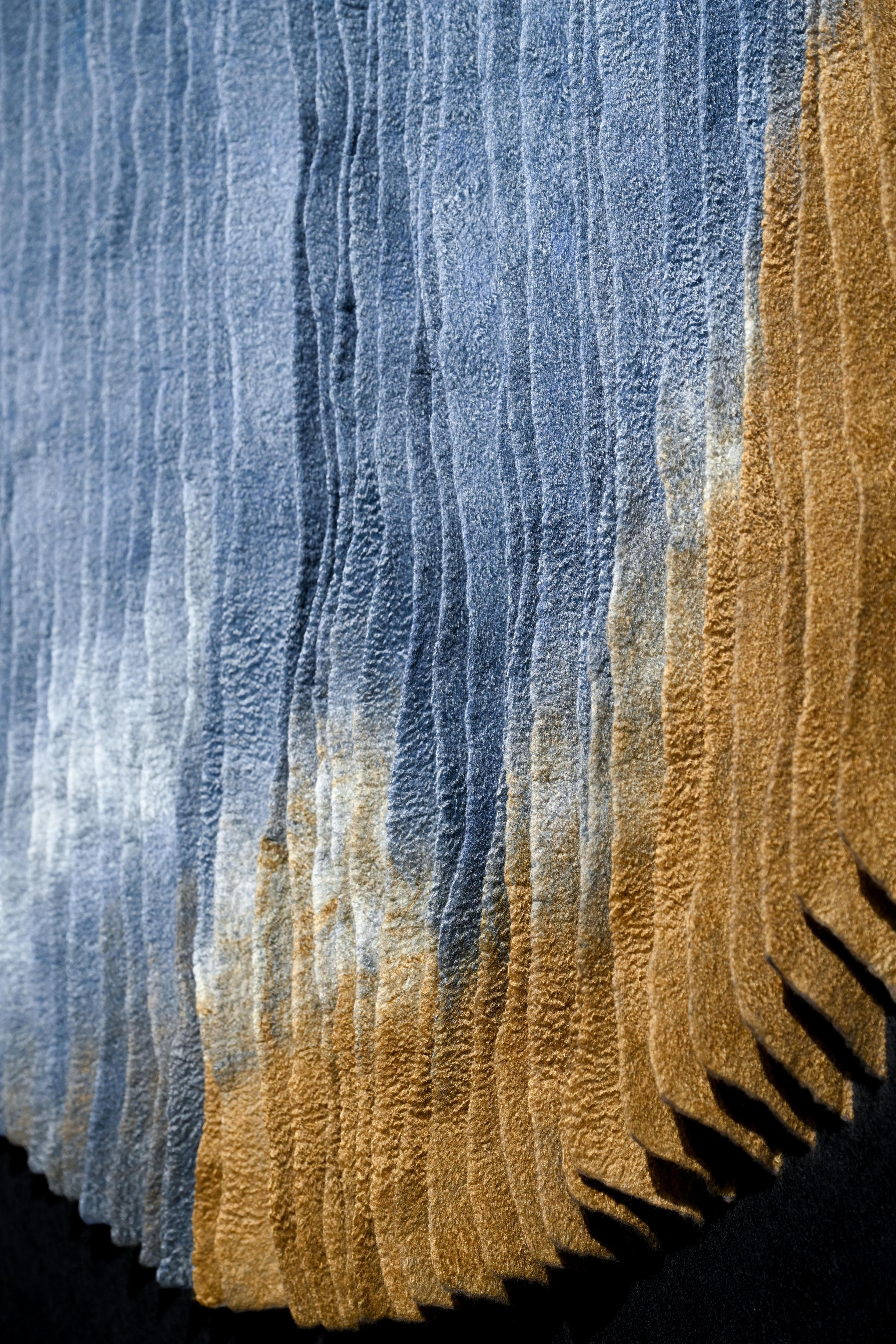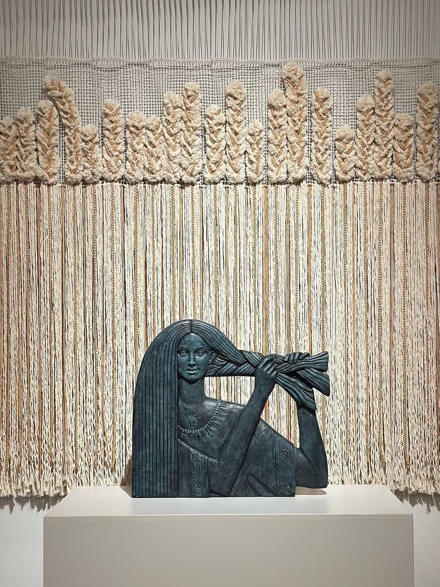 А в соседнем зале художница Милена Хлгатян представила свою работу из войлока — «Ритмы вечности»: благородный серо-голубой, даже стальной, и золотисто-медный, как цвет сосновых стволов или янтаря. Красиво. Но я сразу задумалась — а для меня вечность в каких красках? Мне проще назвать цвета России. Как человек, проехавший страну насквозь, могу сказать, что ее цвета: 50 оттенков зеленого, золотисто-желтый и голубой…На самом деле, страна родная действительно широка, и современному человеку доступен любой ее уголок. Все разнообразие, все богатство мы воспринимаем как родные просторы в объятьях вечности.