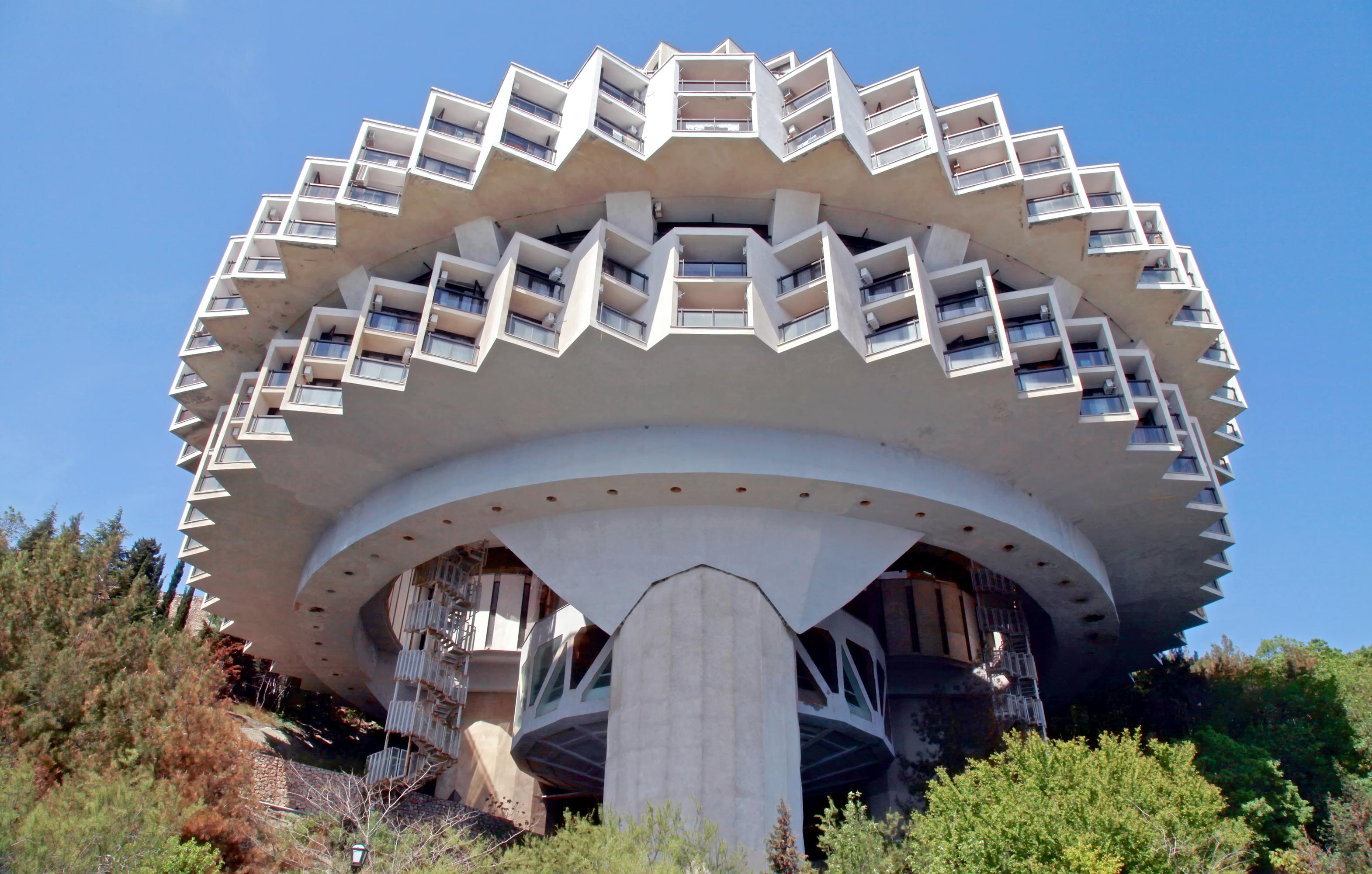 Для своего времени это был новаторский проект: комплекс рассчитан на 630 мест, внутри есть кино-концертный зал, кафе, ресторан. Здание проектировалось сейсмически устойчивым и могло выдержать землетрясение в 9 баллов. Отдельно стоит отметить футуристичный внешний вид и балкончики в форме кабинок фуникулера канатной дороги. По легенде, которую рассказывают местные гиды, здание должно было вращаться, поворачиваясь балконами к солнцу, что, конечно же, маловероятно, учитывая архитектурные возможности 1980-х.