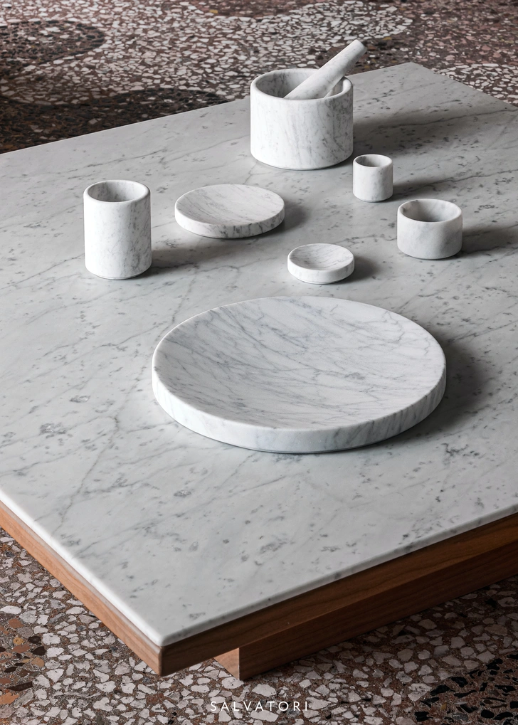 В коллекцию входит посуда для дома из белого каррарского мрамора. Простые формы и холодная красота натурального камня являют собой гармоничный союз геометрии и материала и создают ощущение покоя, умиротворения и стабильности. Рисунок прожилок уникален для каждого предмета — вы не встретите двух одинаковых изделий.
