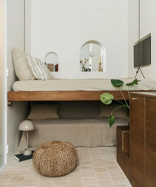 Маленькая студия — не повод отказываться от полноценной спальни, гостиной и вместительных шкафов. Дизайнеры Florquin Studio обновили скромную по размерам квартиру в центре города, где парижская элегантность сочетается с теплотой и простотой Средиземноморья
