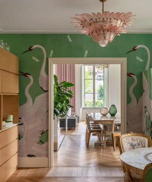 Дизайн этой миланской квартиры построен на контрастах: французская романтика встречается с современной итальянской архитектурой, а зелень сада продолжается в цвете стен и обивки мебели